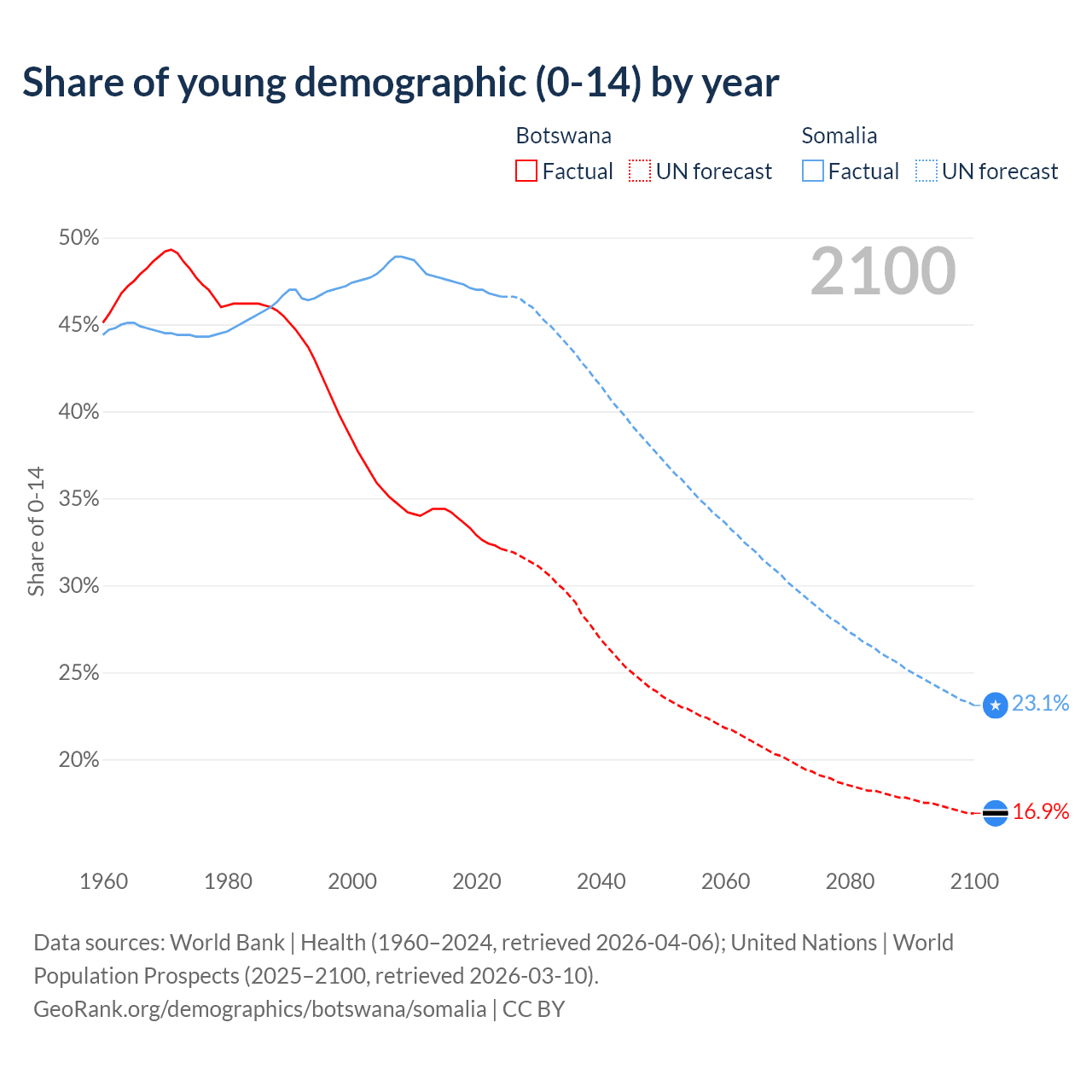- The share of young demographic (0-15 years old) in Botswana is 32.1% vs 46.6% in Somalia.