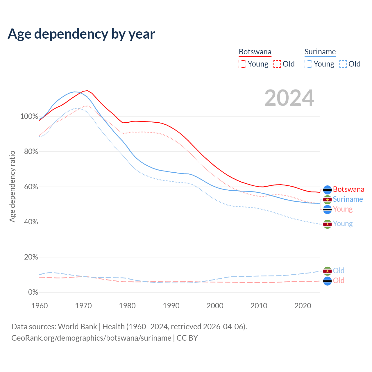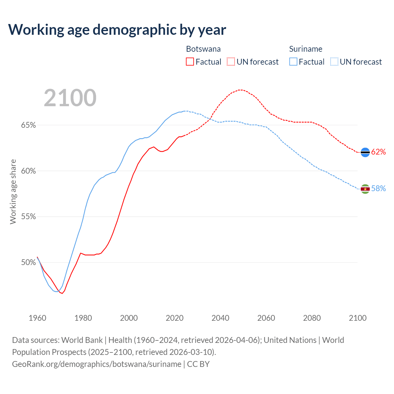 - The share of young demographic (0-15 years old) in Botswana is 32.1% vs 25.6% in Suriname.