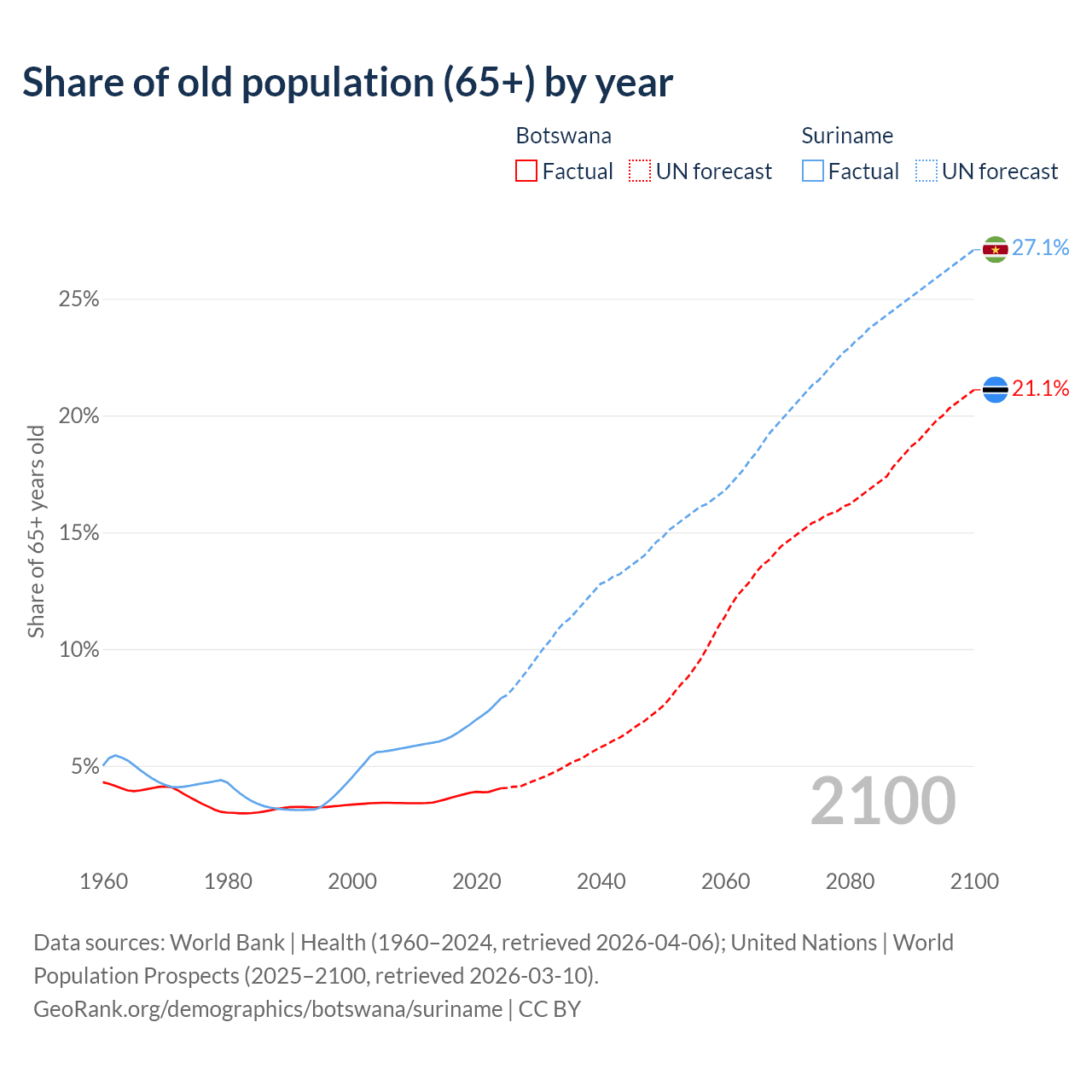The share of older people aged 65 and over is 4.04% in Botswana and 7.9% in Suriname. Life expectancy in Botswana compared to Suriname .