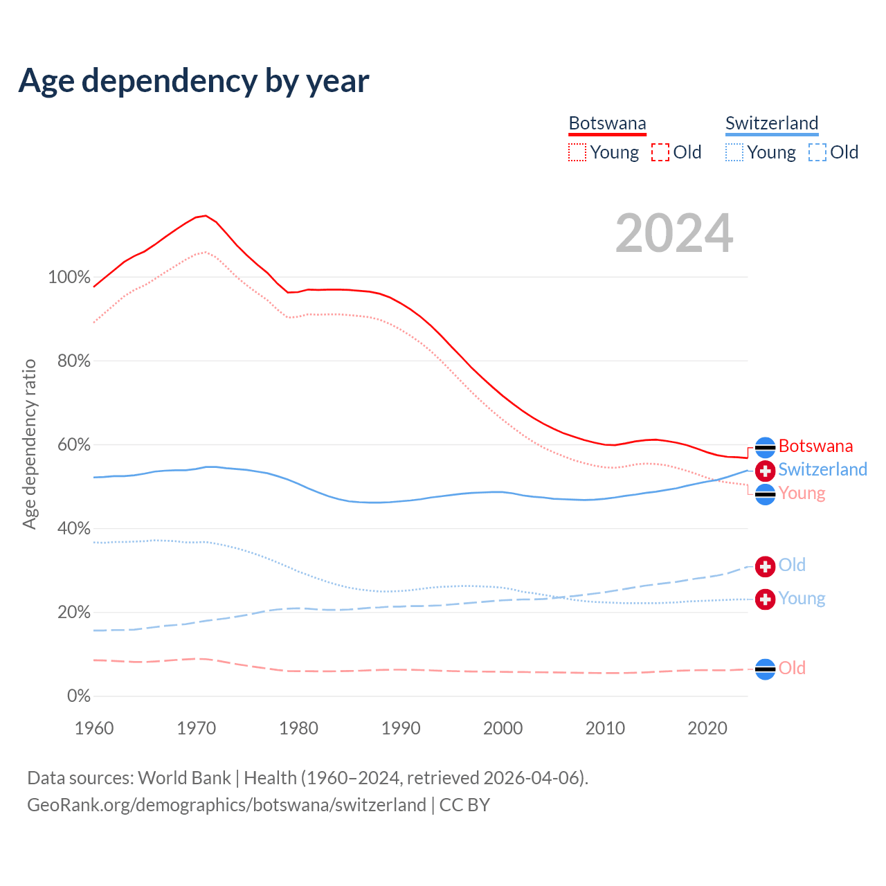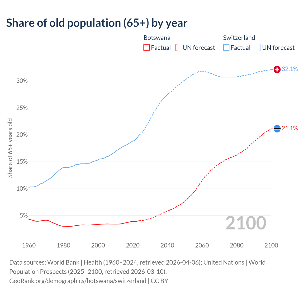 The share of older people aged 65 and over is 4.04% in Botswana and 20% in Switzerland. Life expectancy in Botswana compared to Switzerland .