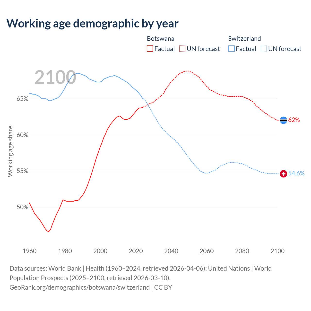 Median age Botswana vs Switzerland, 1960-2100