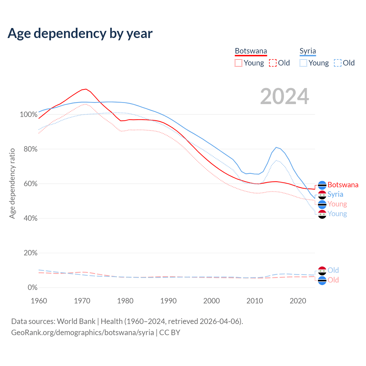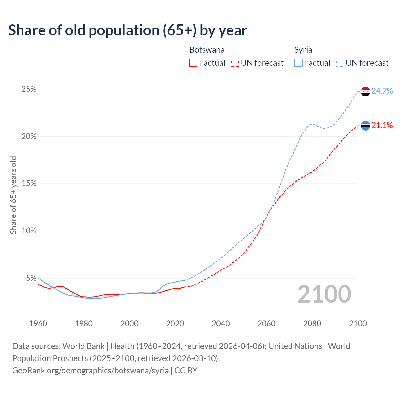 The share of older people aged 65 and over is 4.04% in Botswana and 4.74% in Syria. Life expectancy in Botswana compared to Syria .