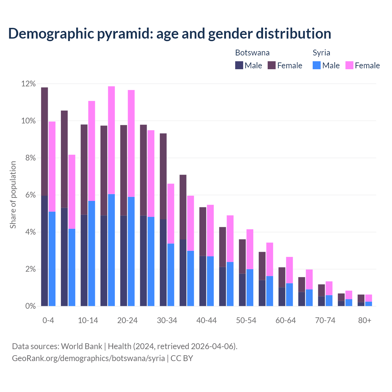- As of 2026, the population of Botswana is 2.62M vs 26.8M in Syria - 10.3 times difference.