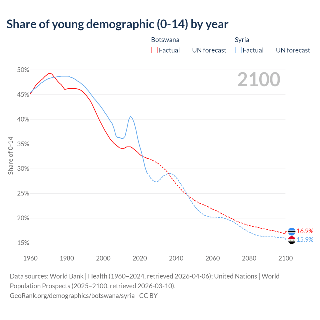 - The share of young demographic (0-15 years old) in Botswana is 32.1% vs 29.2% in Syria.