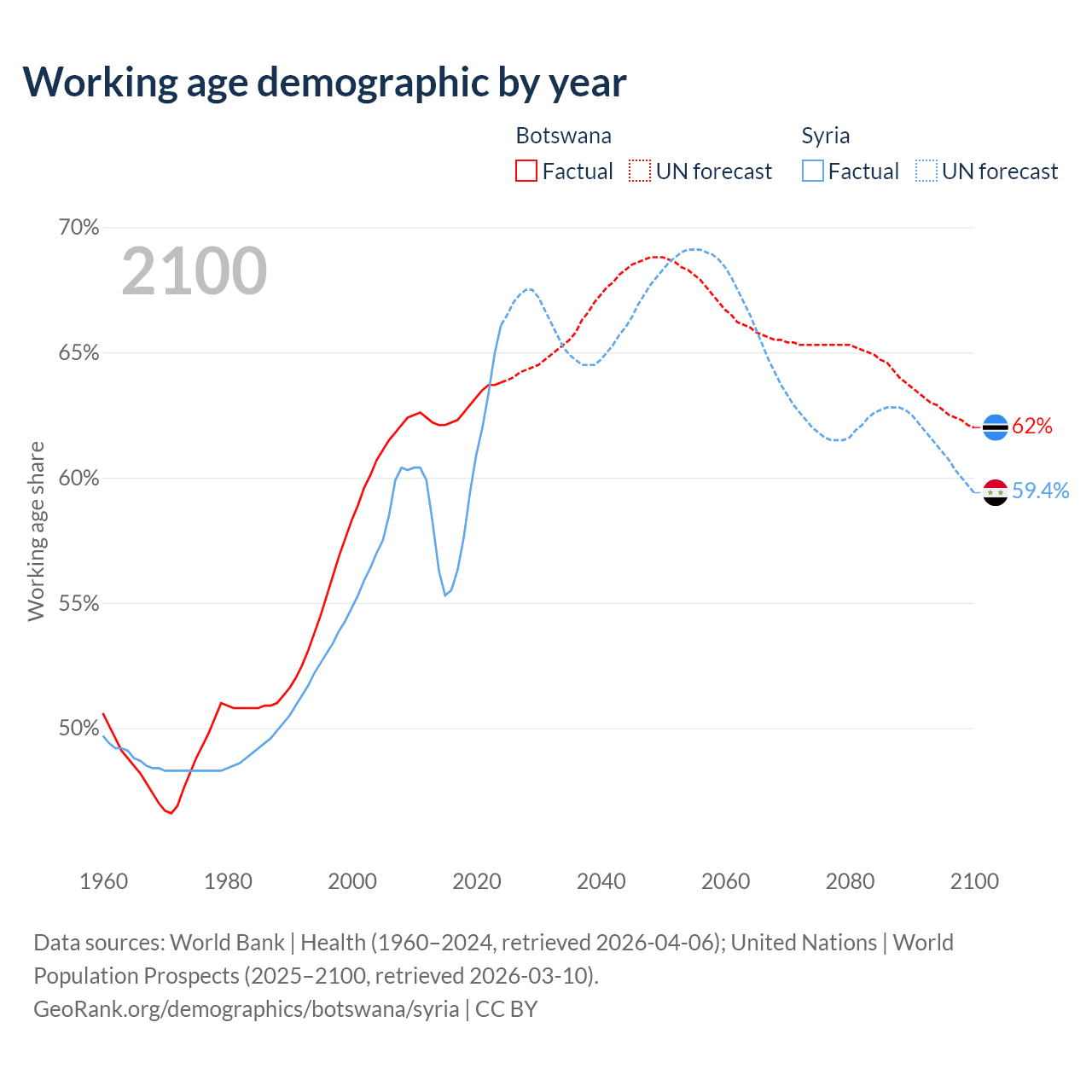 - Botswana has 1.67M working age adults (aged 15-64) vs 17.7M in Syria.
