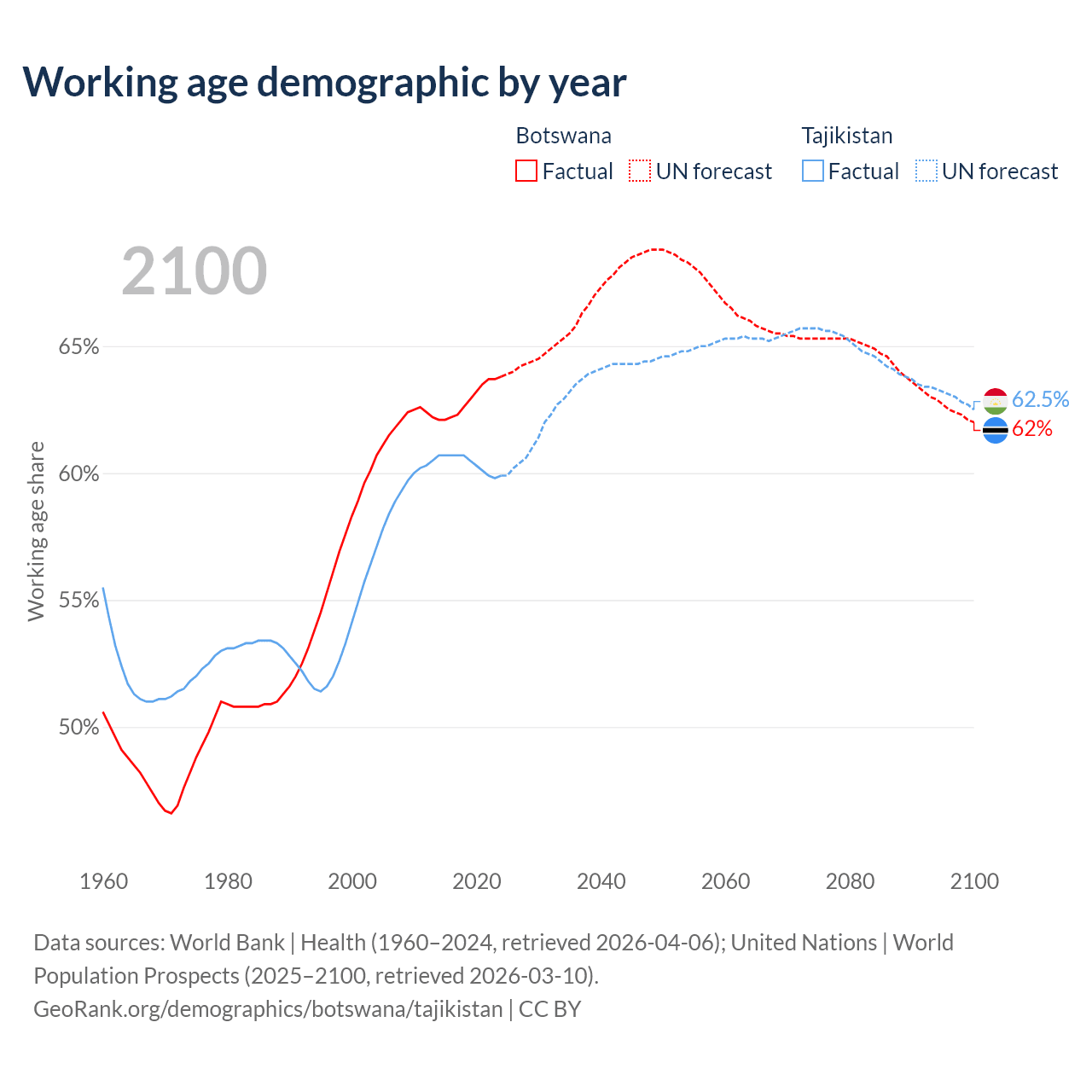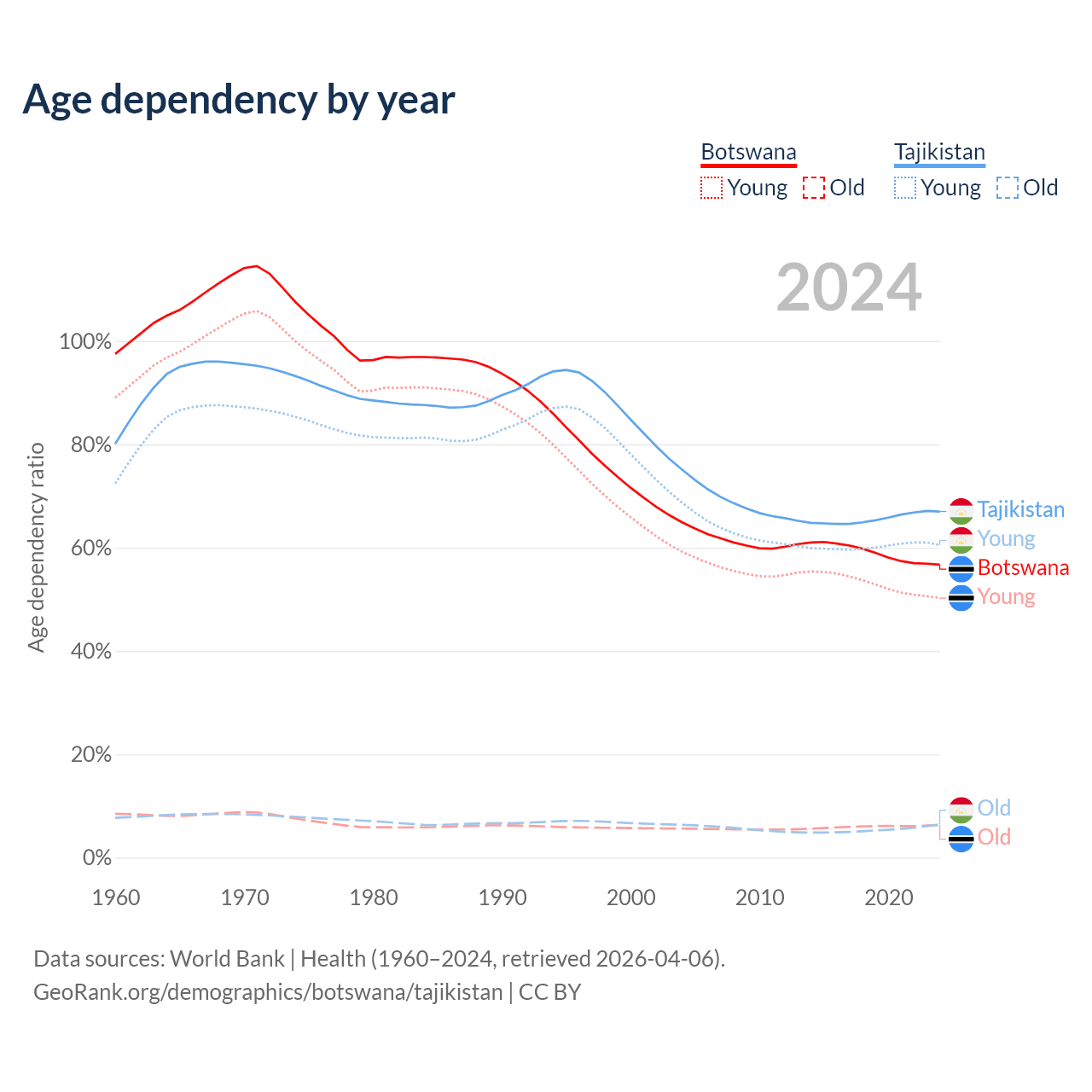 - The share of old-age demographic (65+) in Botswana is 4.04% vs 3.85% in Tajikistan.