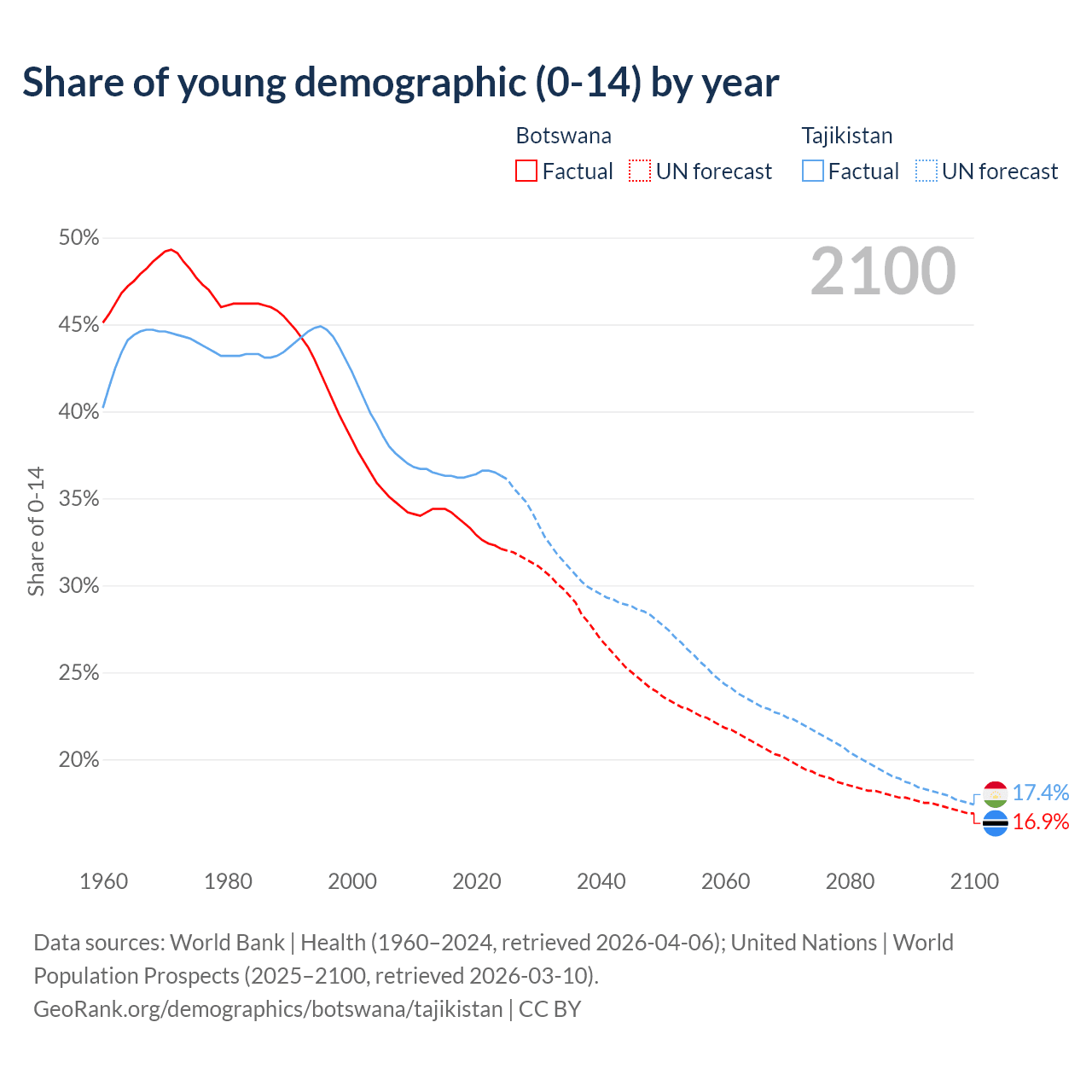 - The share of young demographic (0-15 years old) in Botswana is 32.1% vs 36.3% in Tajikistan.