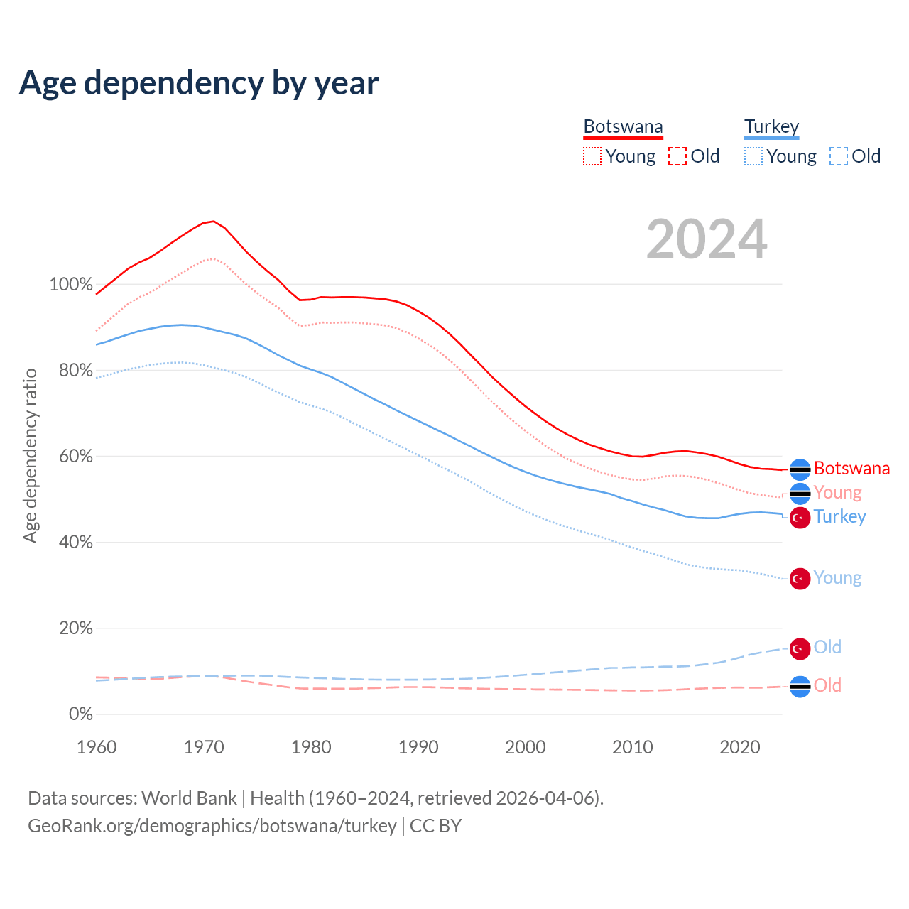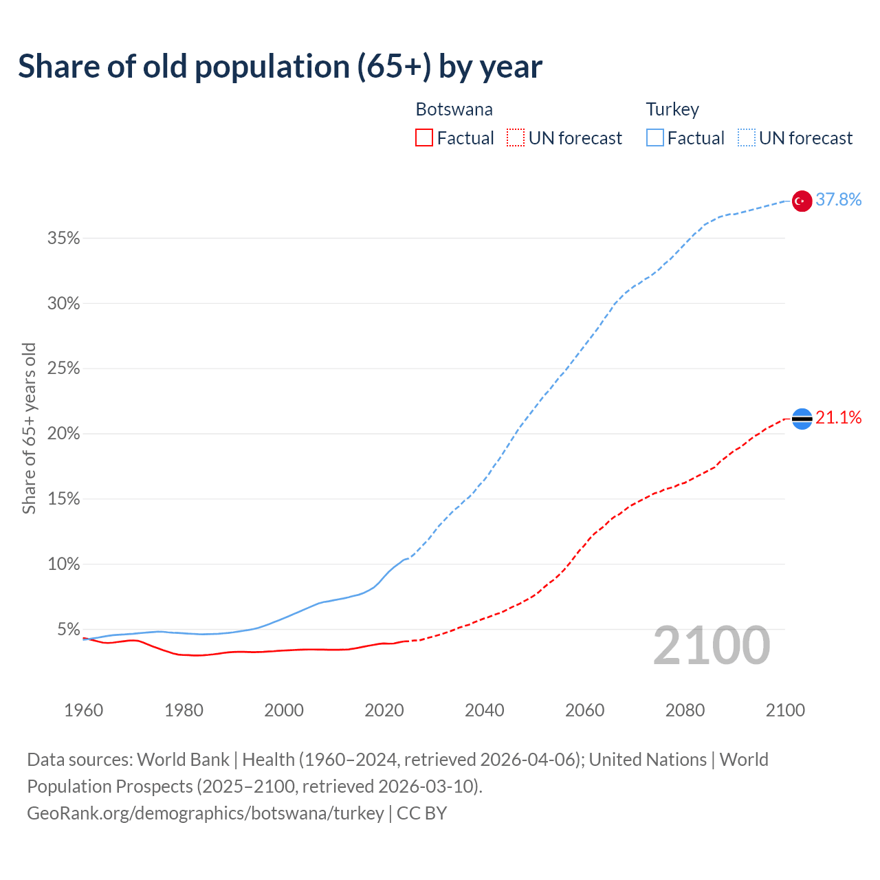 The share of older people aged 65 and over is 4.04% in Botswana and 10.3% in Turkey. Life expectancy in Botswana compared to Turkey .