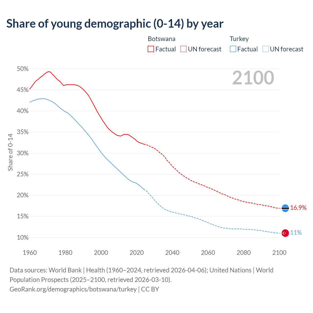 - The share of young demographic (0-15 years old) in Botswana is 32.1% vs 21.4% in Turkey.