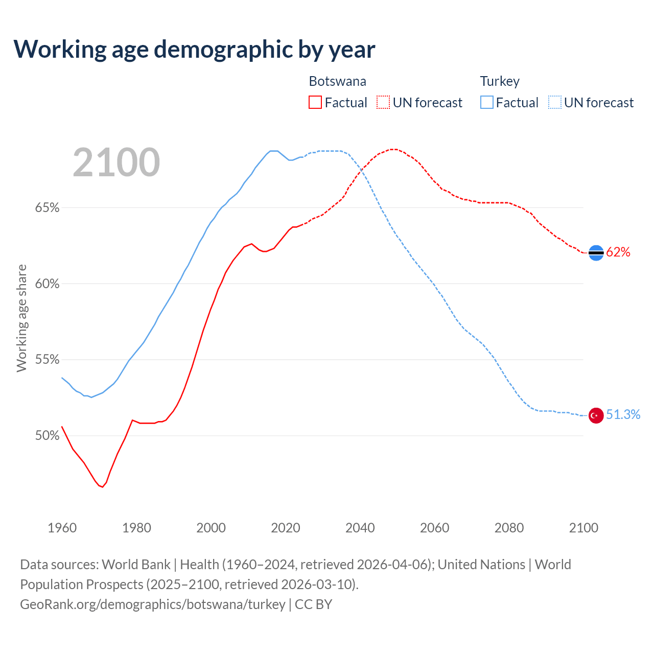 Median age Botswana vs Turkey, 1960-2100