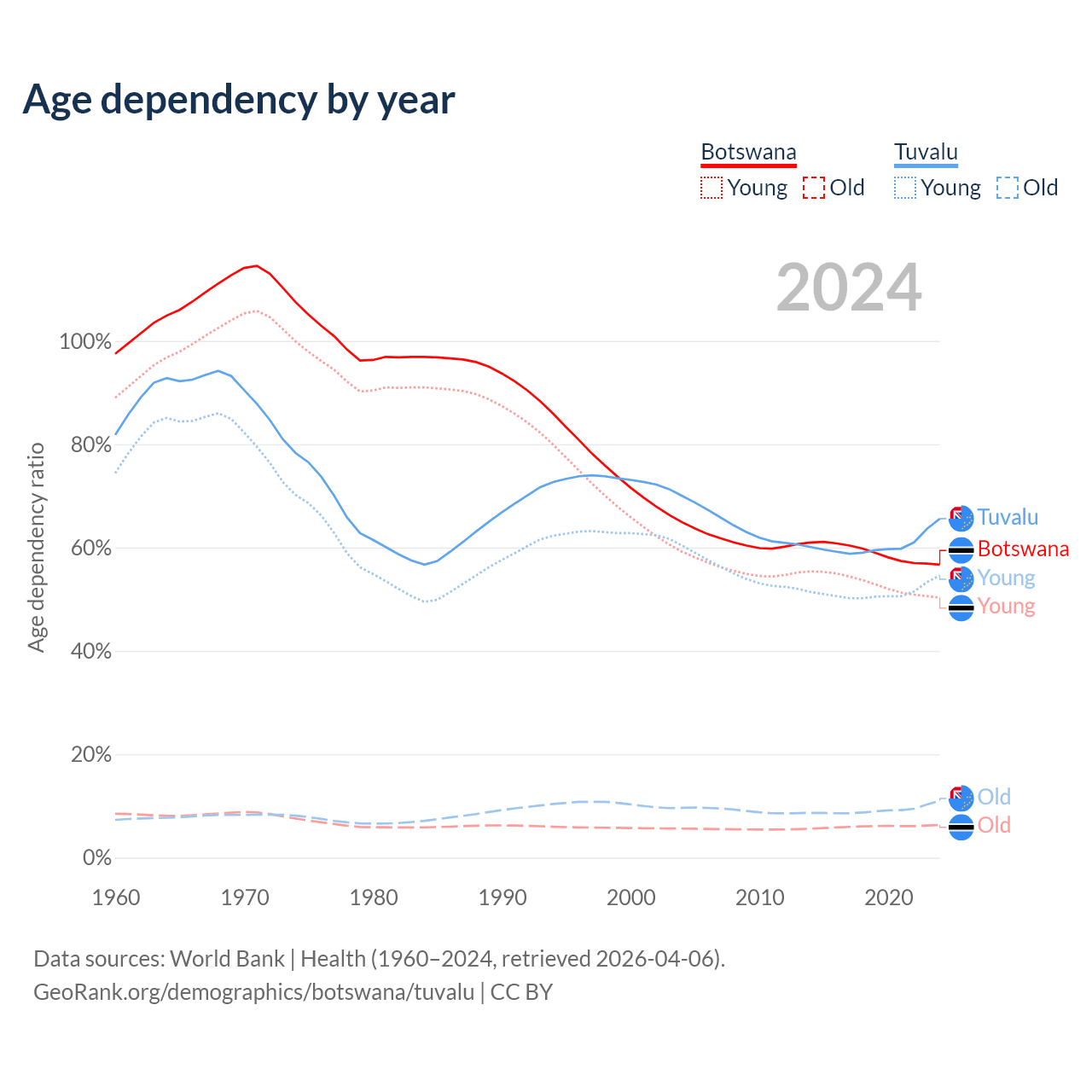 The share of older people aged 65 and over is 4.04% in Botswana and 6.67% in Tuvalu. Life expectancy in Botswana compared to Tuvalu .