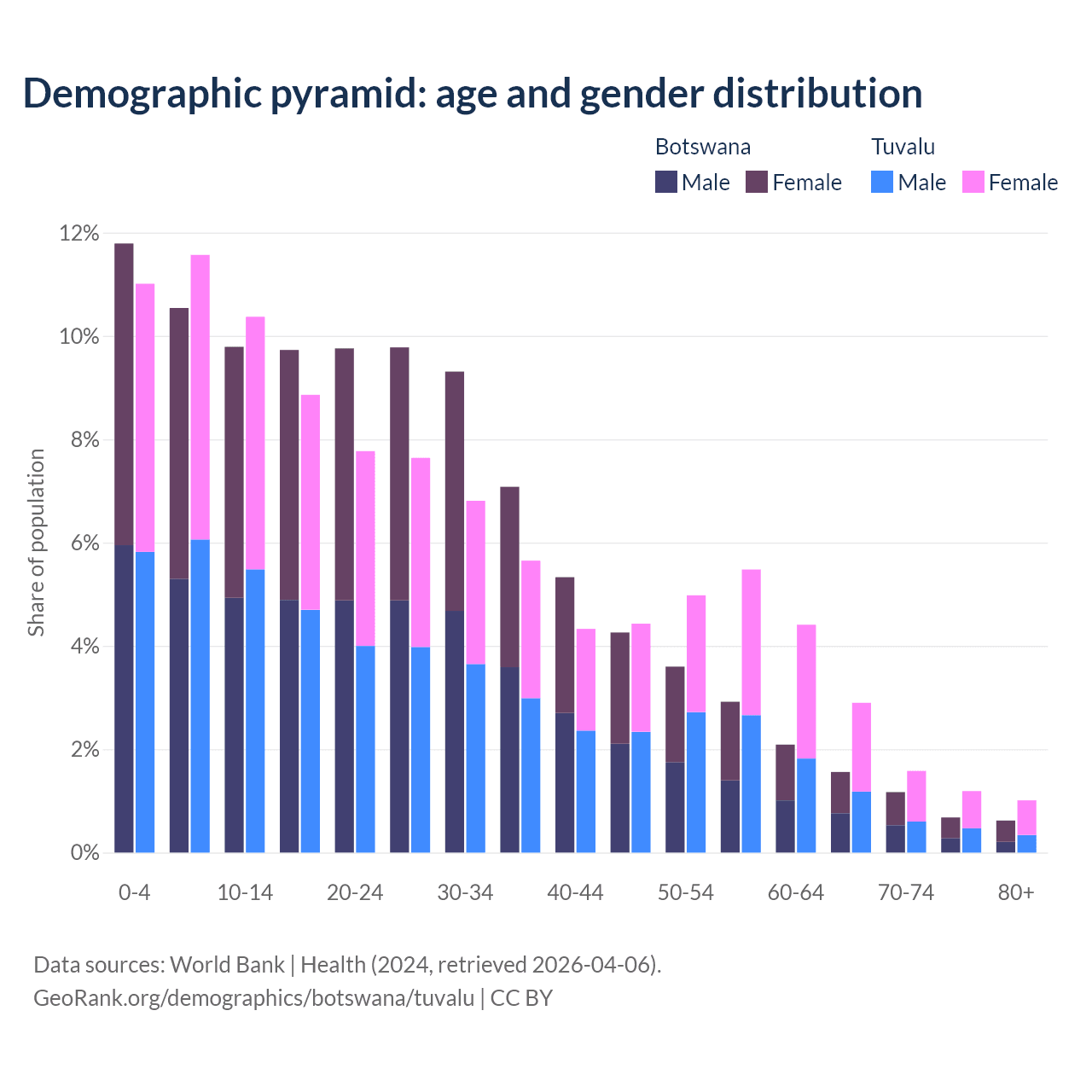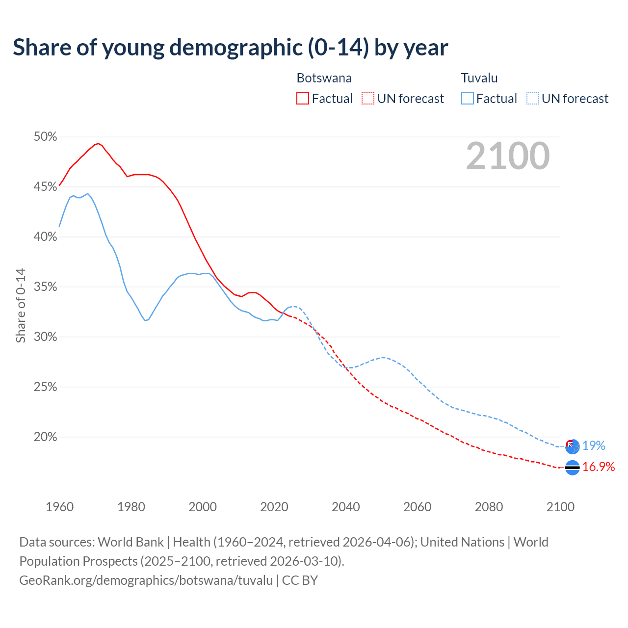 - The share of young demographic (0-15 years old) in Botswana is 32.1% vs 32.9% in Tuvalu.