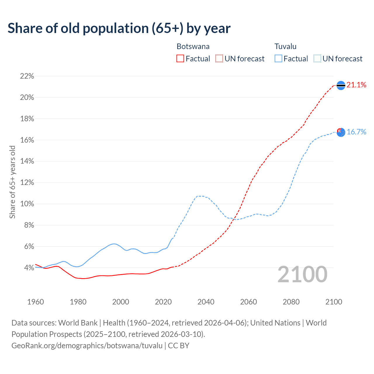 - The share of old-age demographic (65+) in Botswana is 4.04% vs 6.67% in Tuvalu.