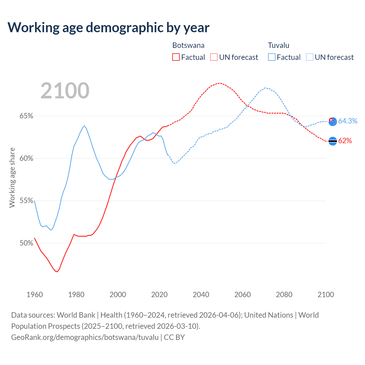 - Botswana has 1.67M working age adults (aged 15-64) vs 5.64K in Tuvalu.