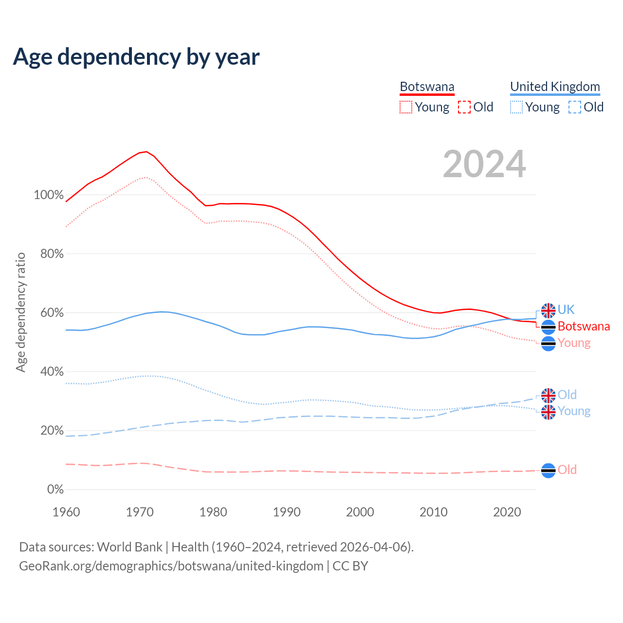 The share of older people aged 65 and over is 4.04% in Botswana and 19.5% in the United Kingdom. Life expectancy in Botswana compared to the United Kingdom .