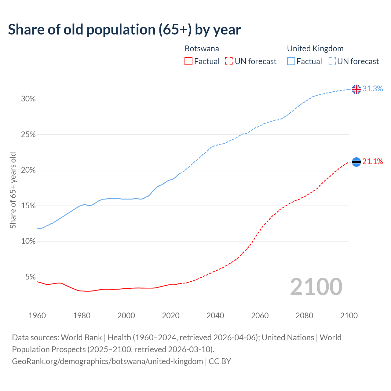 - The share of old-age demographic (65+) in Botswana is 4.04% vs 19.5% in the United Kingdom.