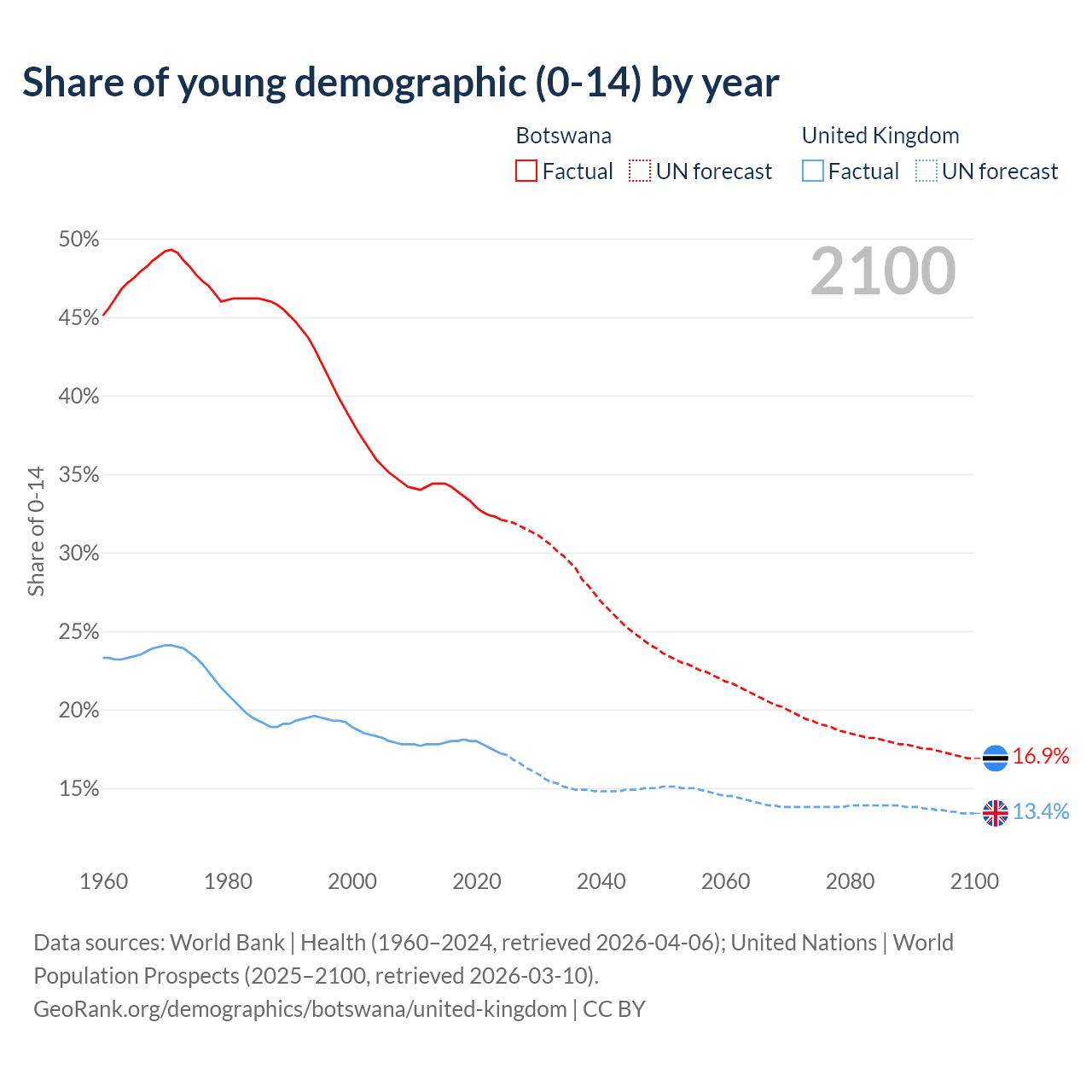 - The share of young demographic (0-15 years old) in Botswana is 32.1% vs 17.2% in the United Kingdom.