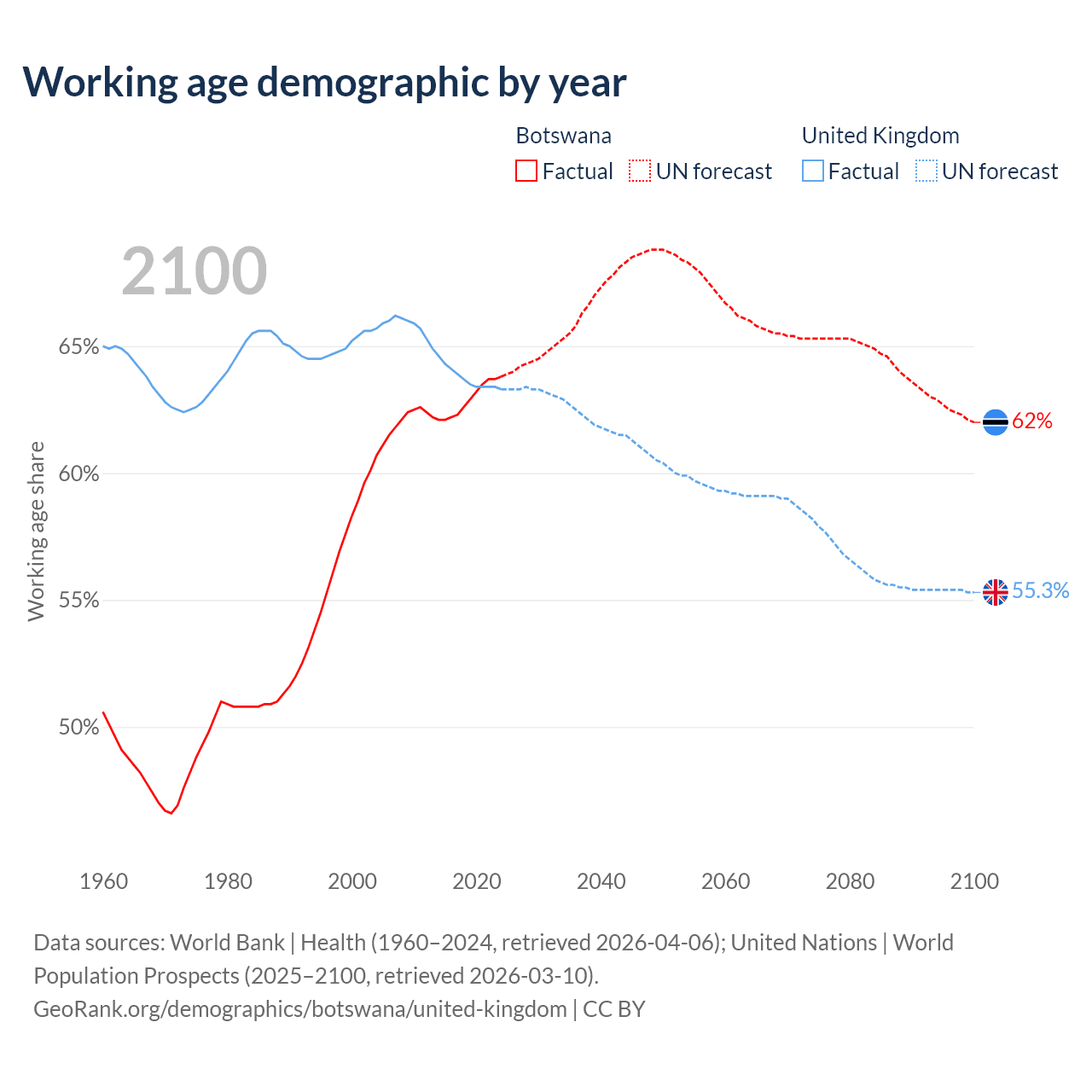 - Botswana has 1.67M working age adults (aged 15-64) vs 44.4M in the United Kingdom.