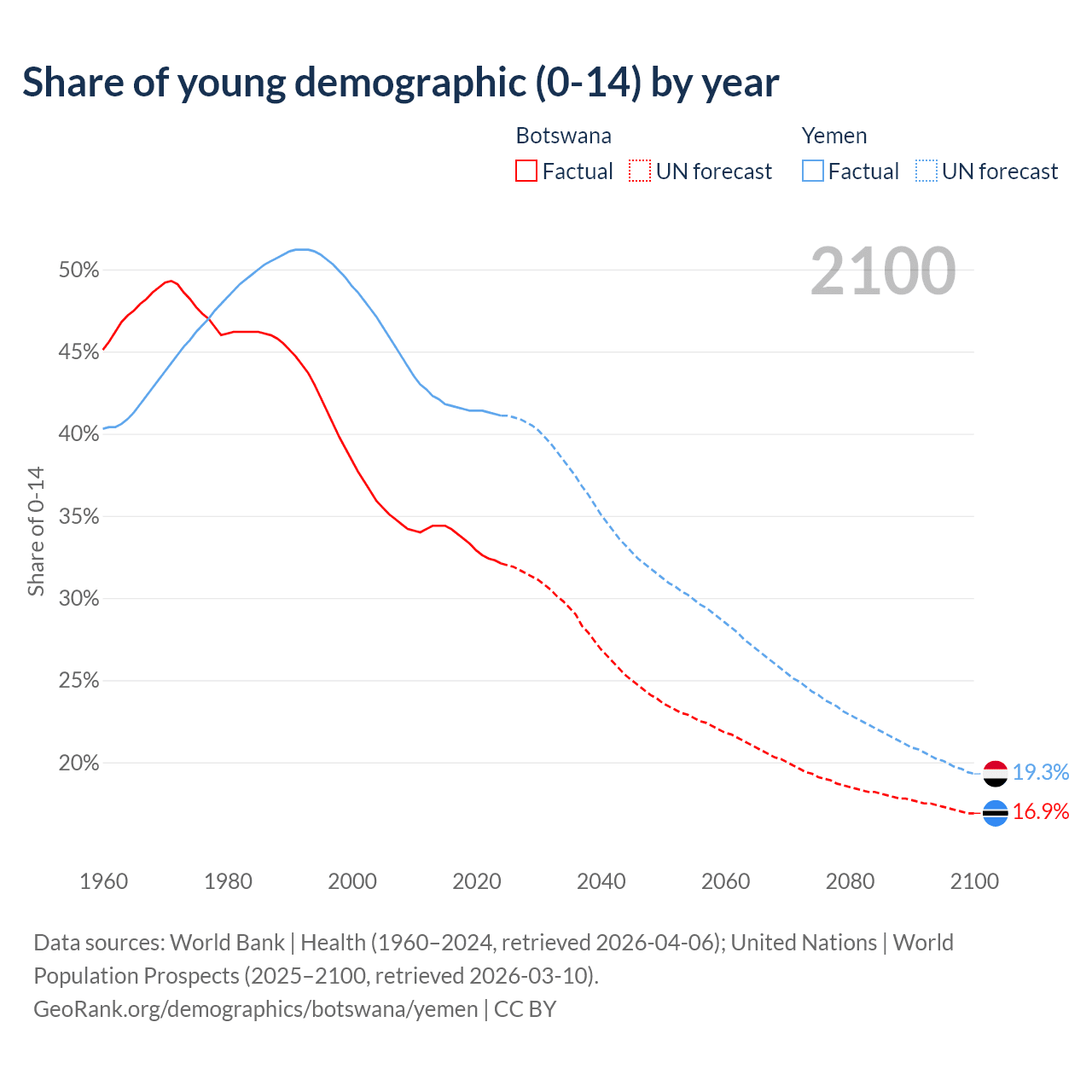 - The share of young demographic (0-15 years old) in Botswana is 32.1% vs 41.1% in Yemen.