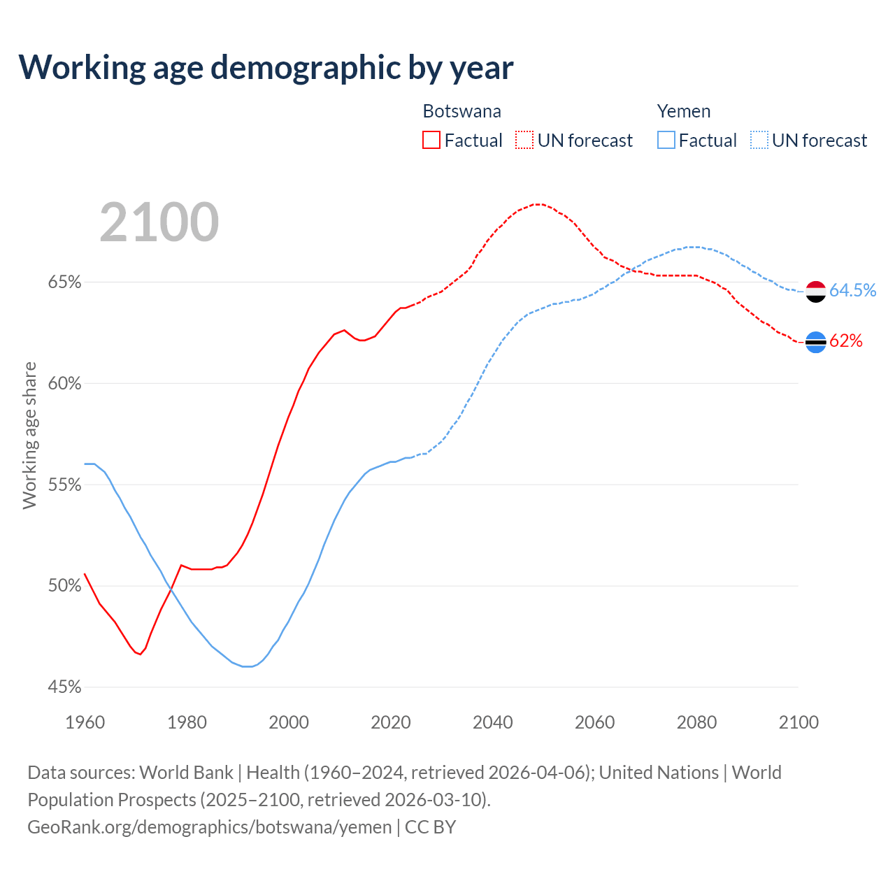 - Botswana has 1.67M working age adults (aged 15-64) vs 24.4M in Yemen.