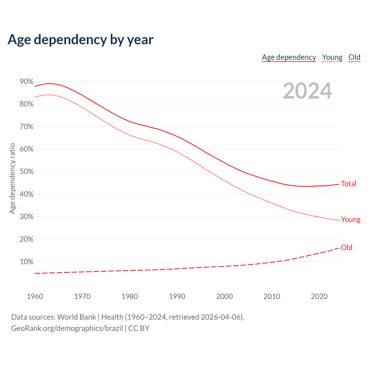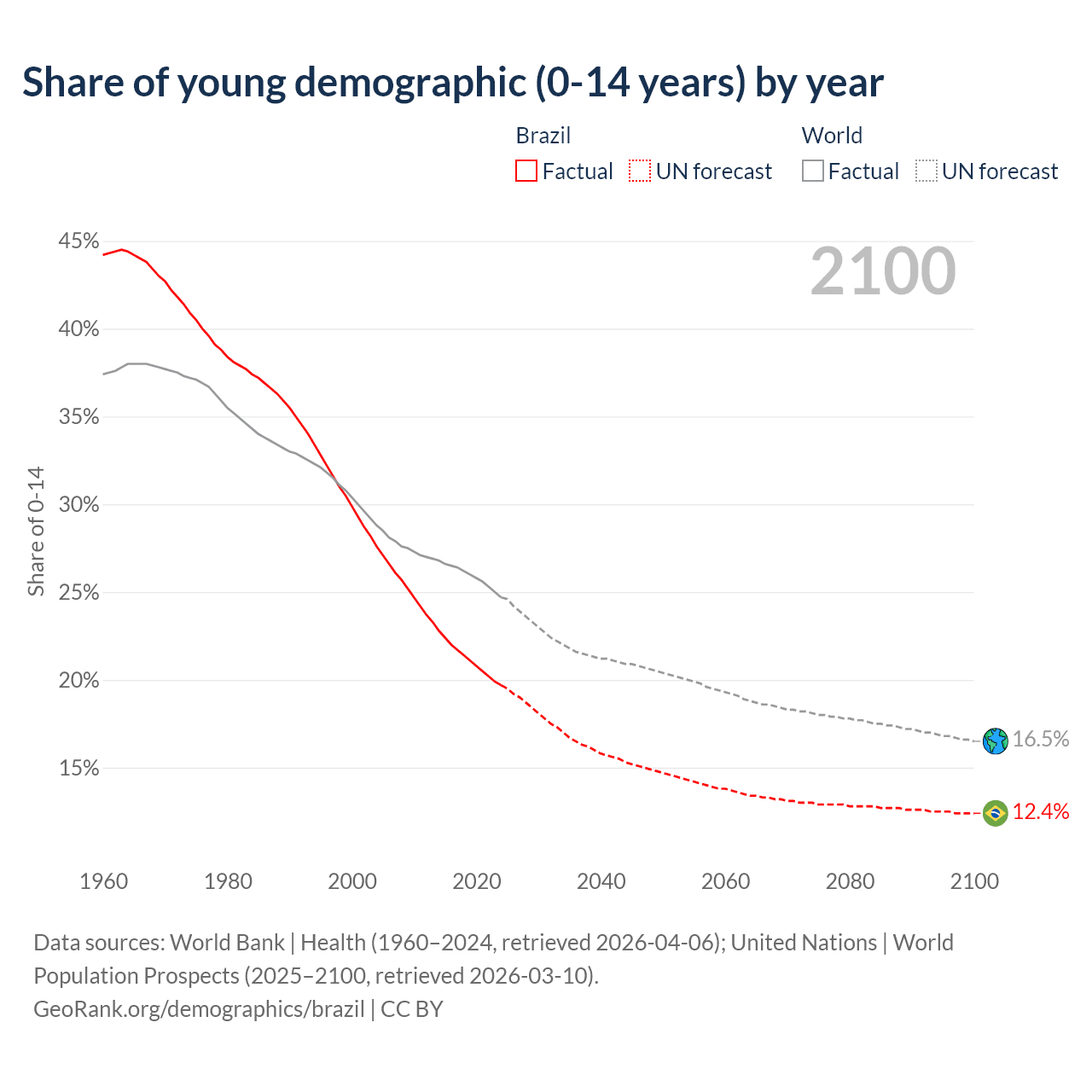 The share of children aged 0-14 in Brazil decreased from 27.6% to 19.7% between 2004 and 2024 due to changes in birth rates.
