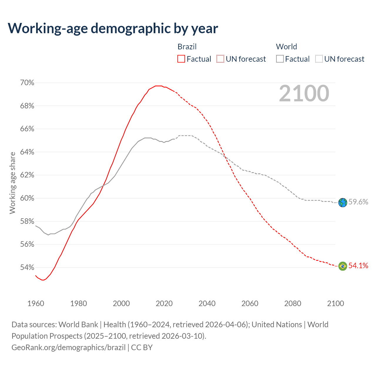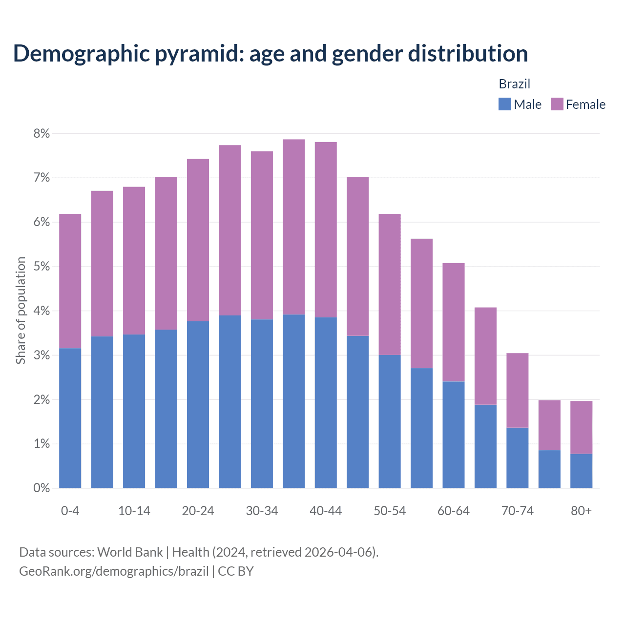 With a population of 212M people, Brazil has a median age of 35.4 years which makes it the 73/196 oldest country. 19.7% of the demographic are children 0-14 years old, 69.3% are working-age people aged 15-64, and 11% are older population aged 65+ years.