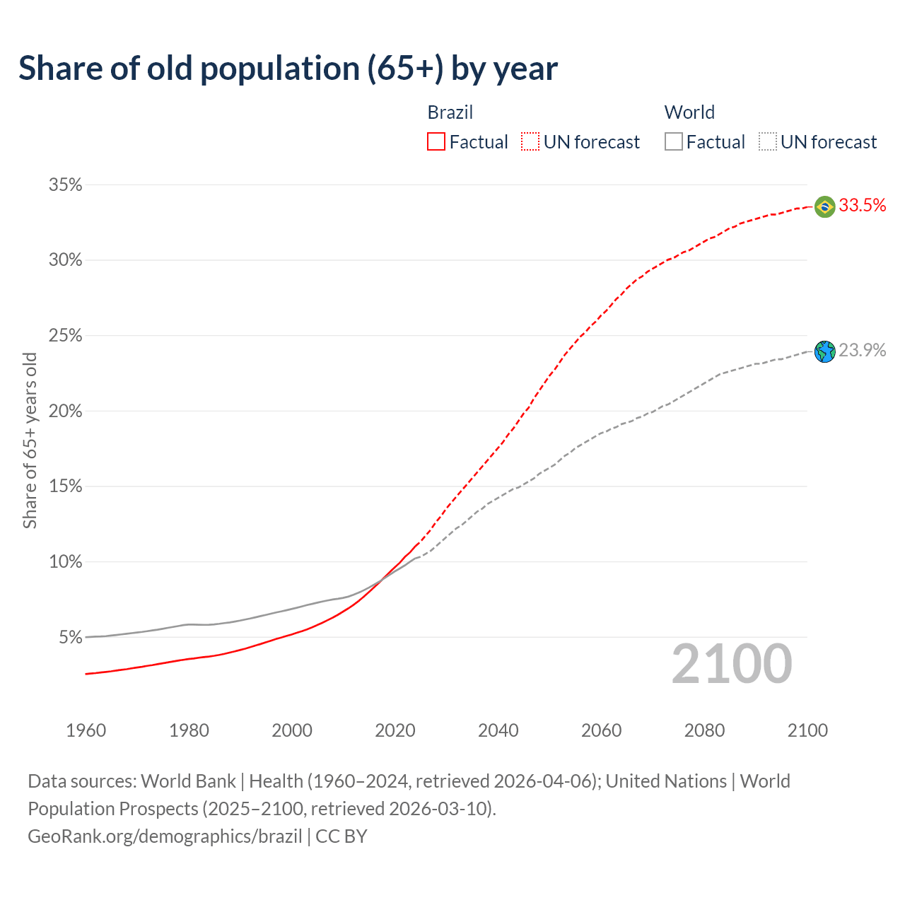 The share of older people aged 65 and over in Brazil increased from 5.63% to 11% between 2004 and 2024.