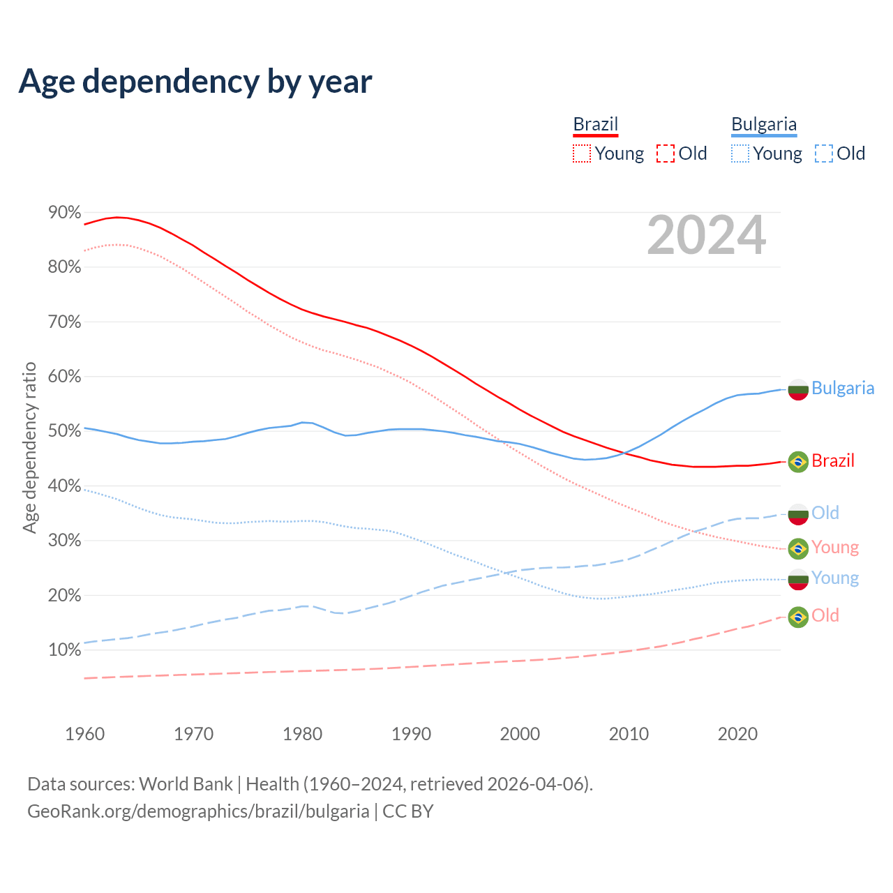 Data sources: World Bank | Health (1960–2024, retrieved 2026-04-06); U.S. Census Bureau (1960–2024, retrieved 2026-02-08).