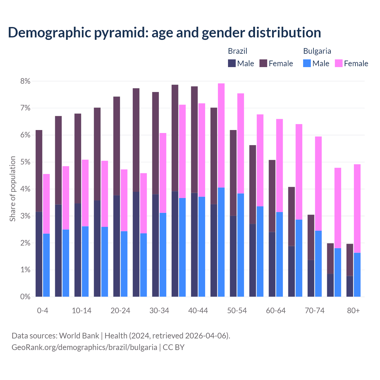 The share of older people aged 65 and over is 11% in Brazil and 22% in Bulgaria. Life expectancy in Brazil compared to Bulgaria .