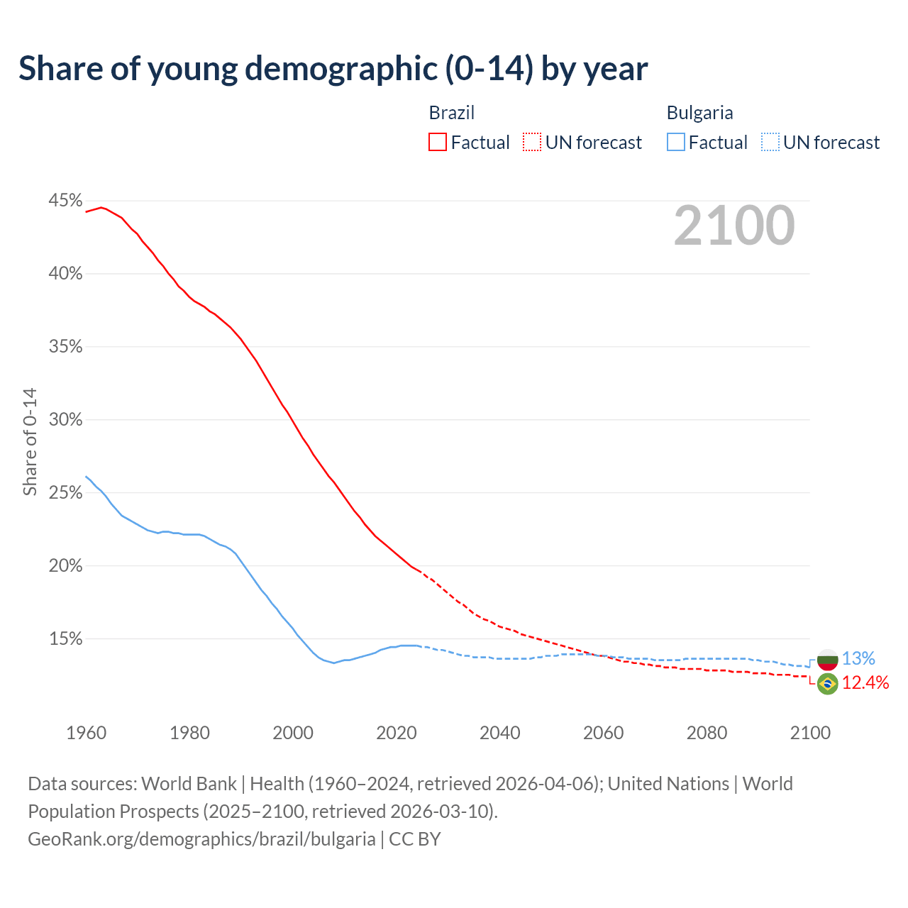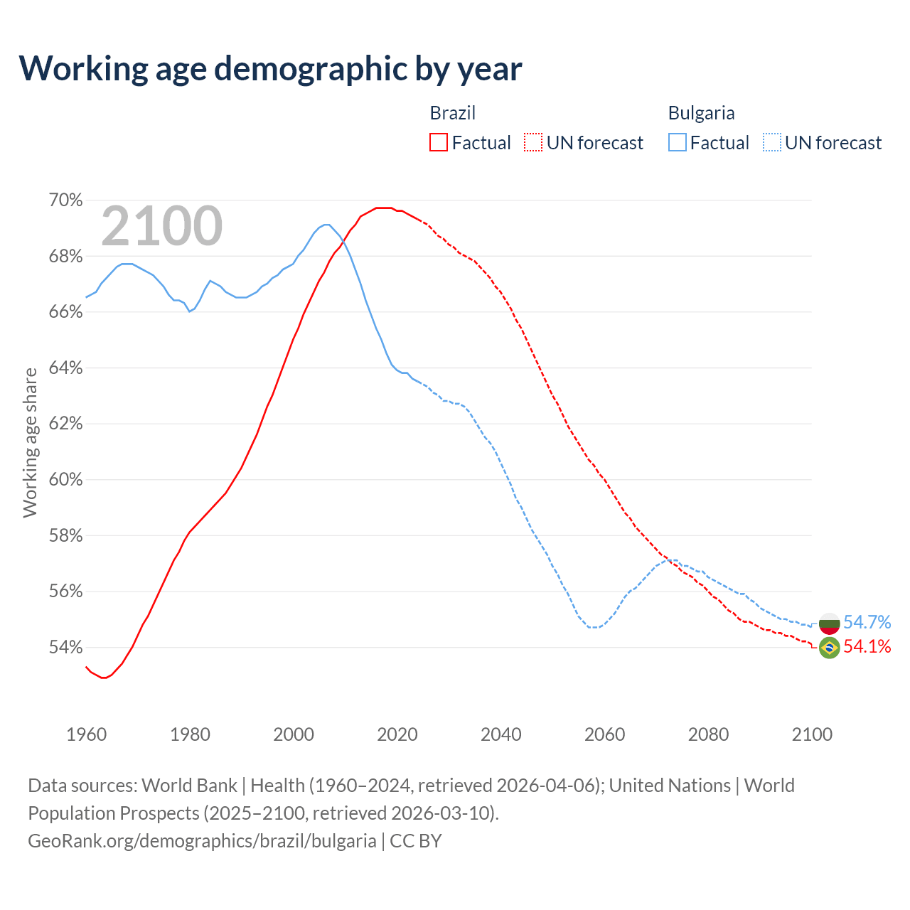 Median age Brazil vs Bulgaria, 1960-2100