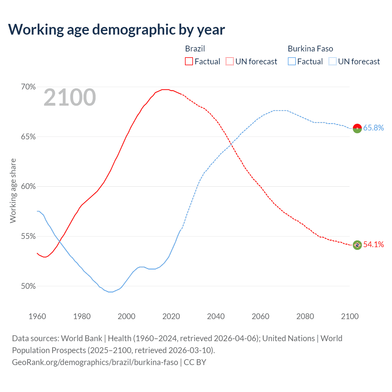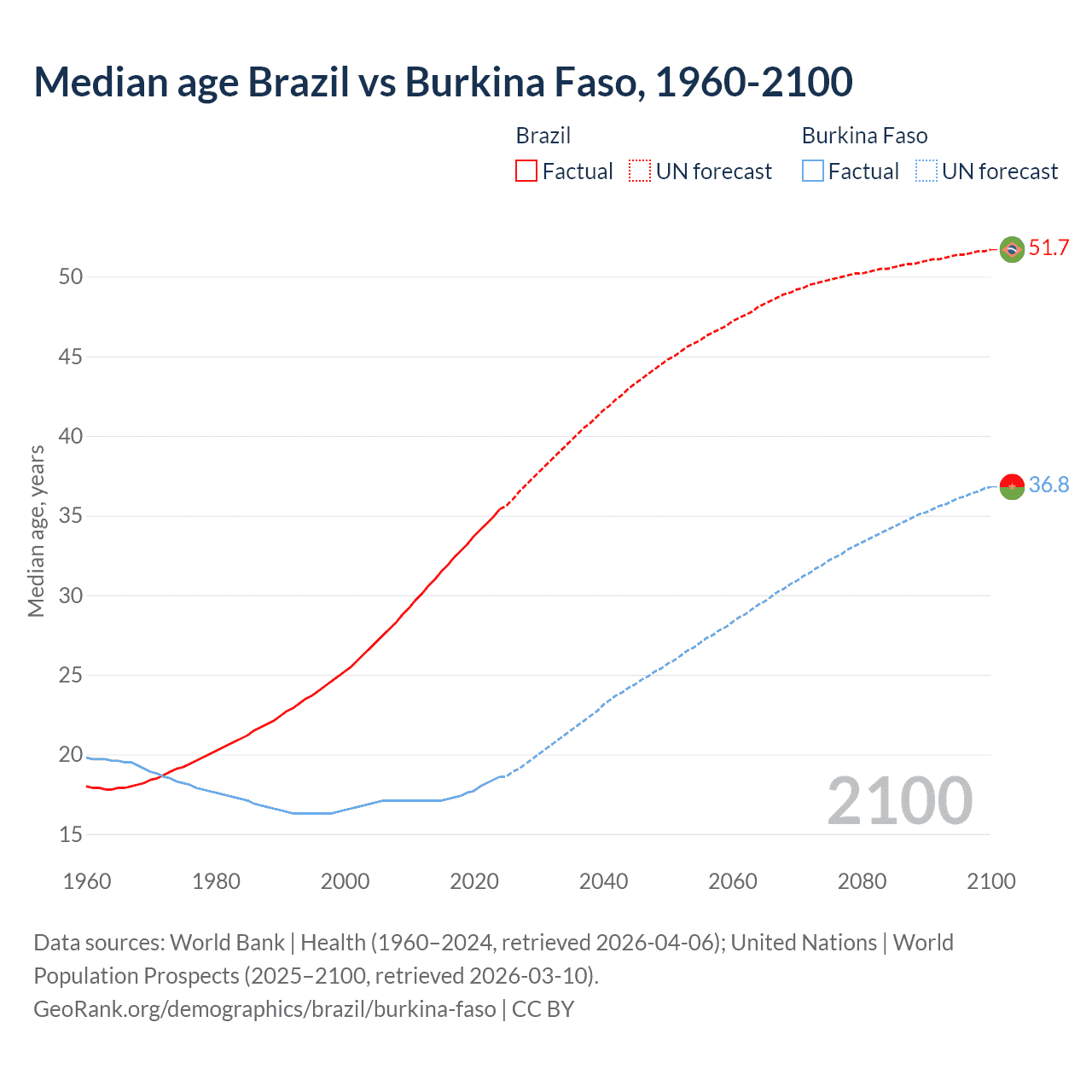 Median age Brazil vs Burkina Faso, 1960-2100