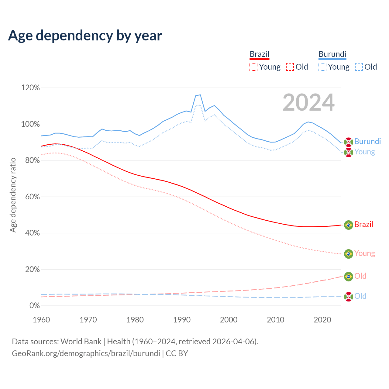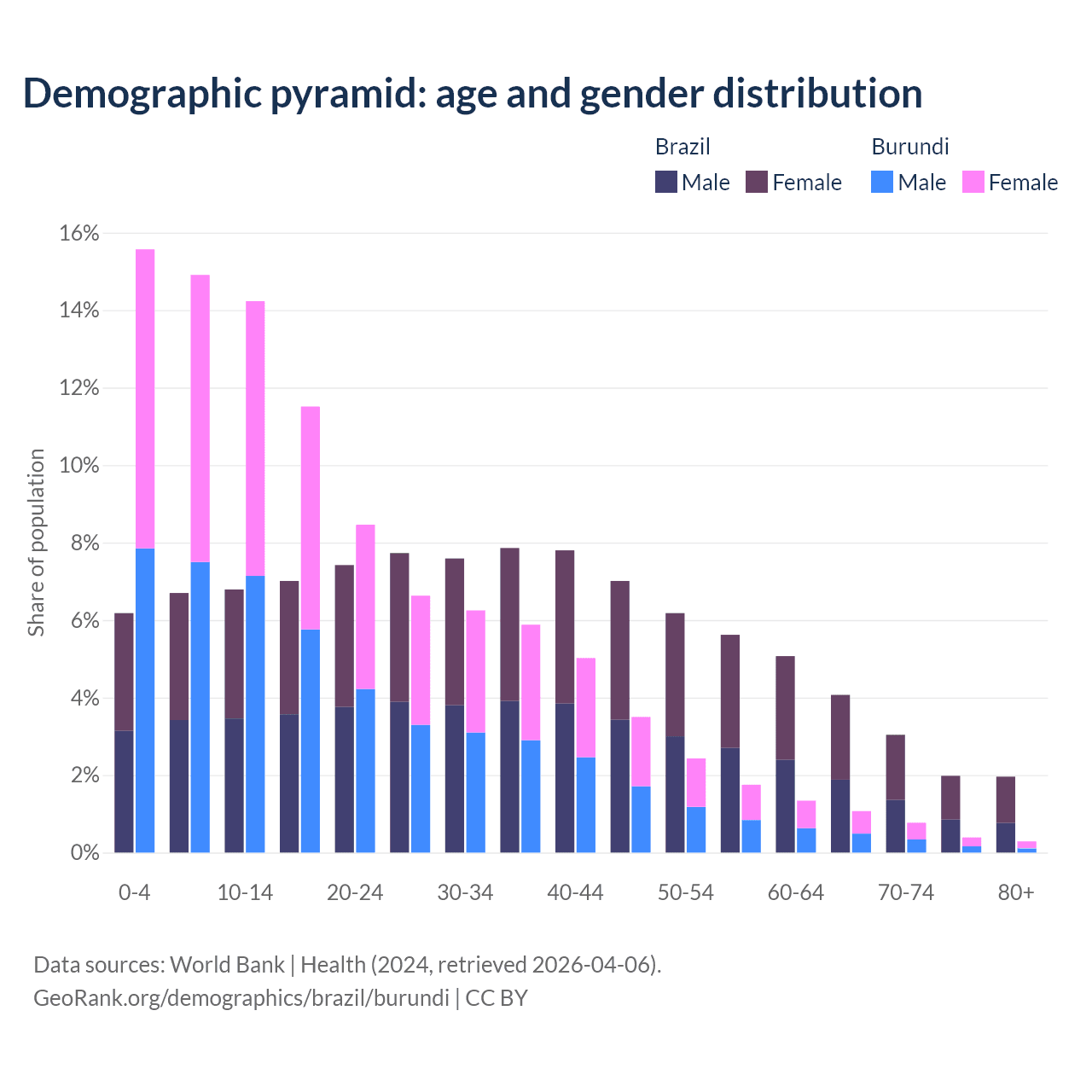 - Brazil is ranked 73/196 by median age (oldest to youngest) vs 190/196 for Burundi.
