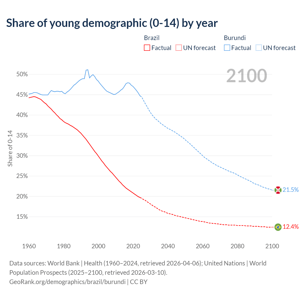 - The share of young demographic (0-15 years old) in Brazil is 19.7% vs 44.7% in Burundi.