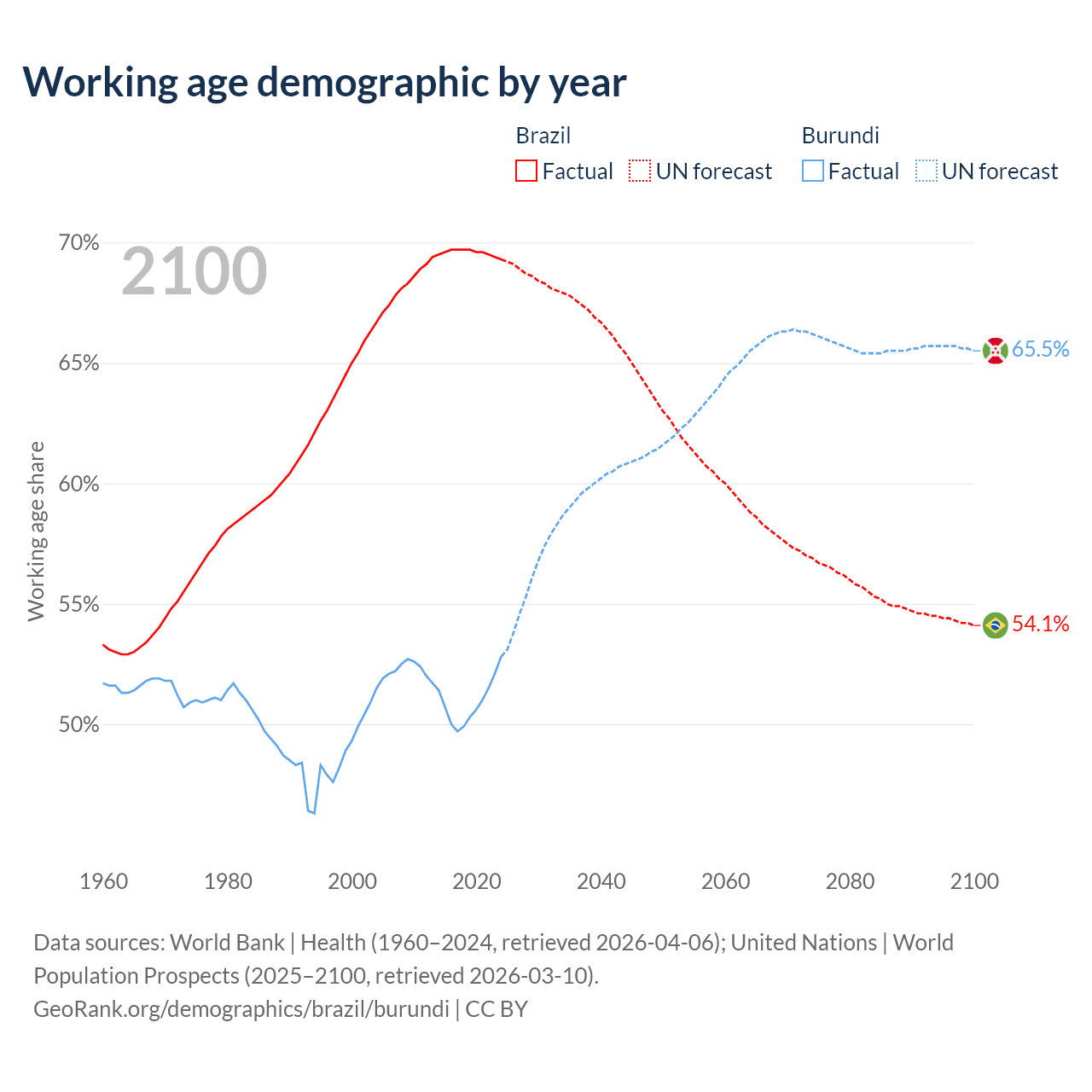 - Brazil has 148M working age adults (aged 15-64) vs 7.83M in Burundi.