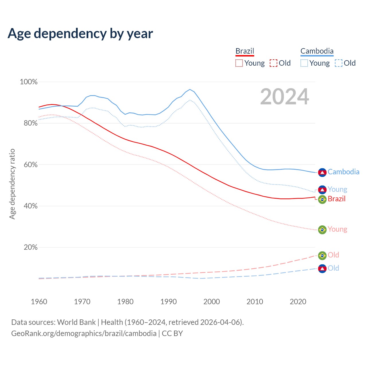 - The share of old-age demographic (65+) in Brazil is 11% vs 6.16% in Cambodia.