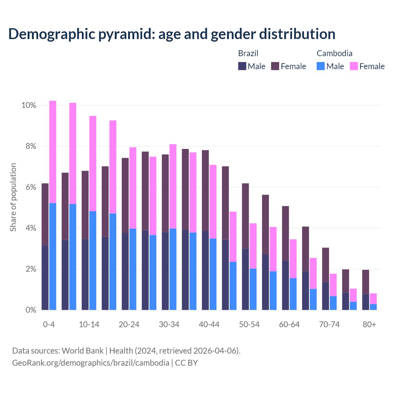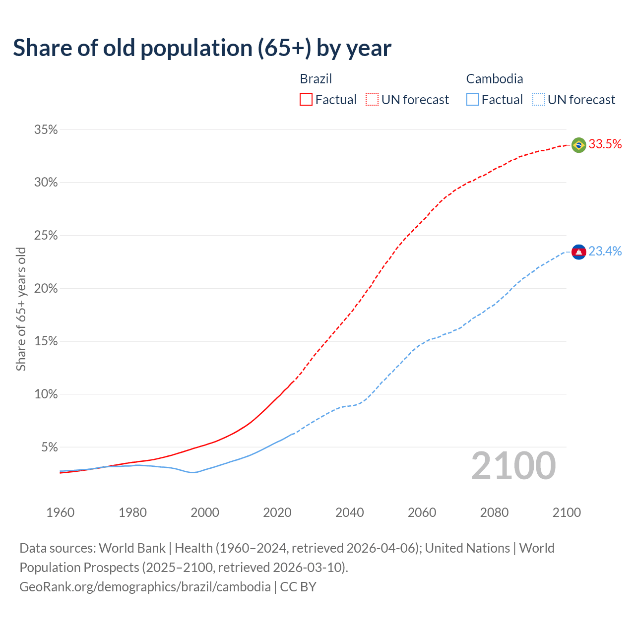 The share of older people aged 65 and over is 11% in Brazil and 6.16% in Cambodia. Life expectancy in Brazil compared to Cambodia .