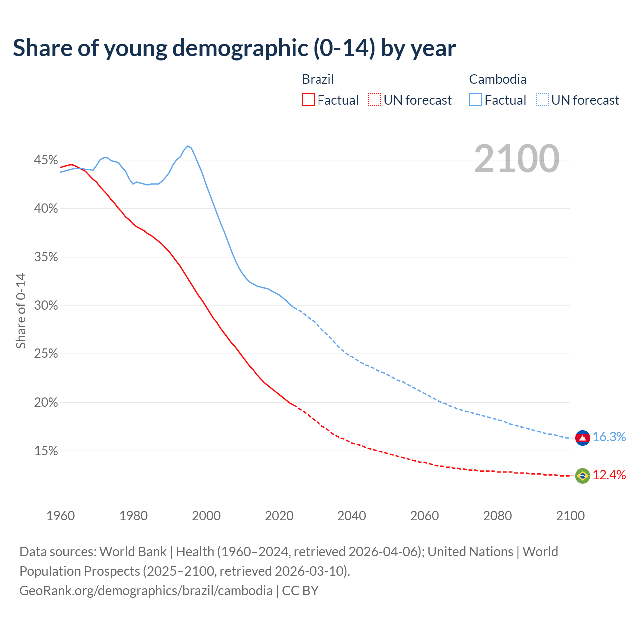 - The total fertility rate is 1.62 in Brazil compared to 2.58 in Cambodia.