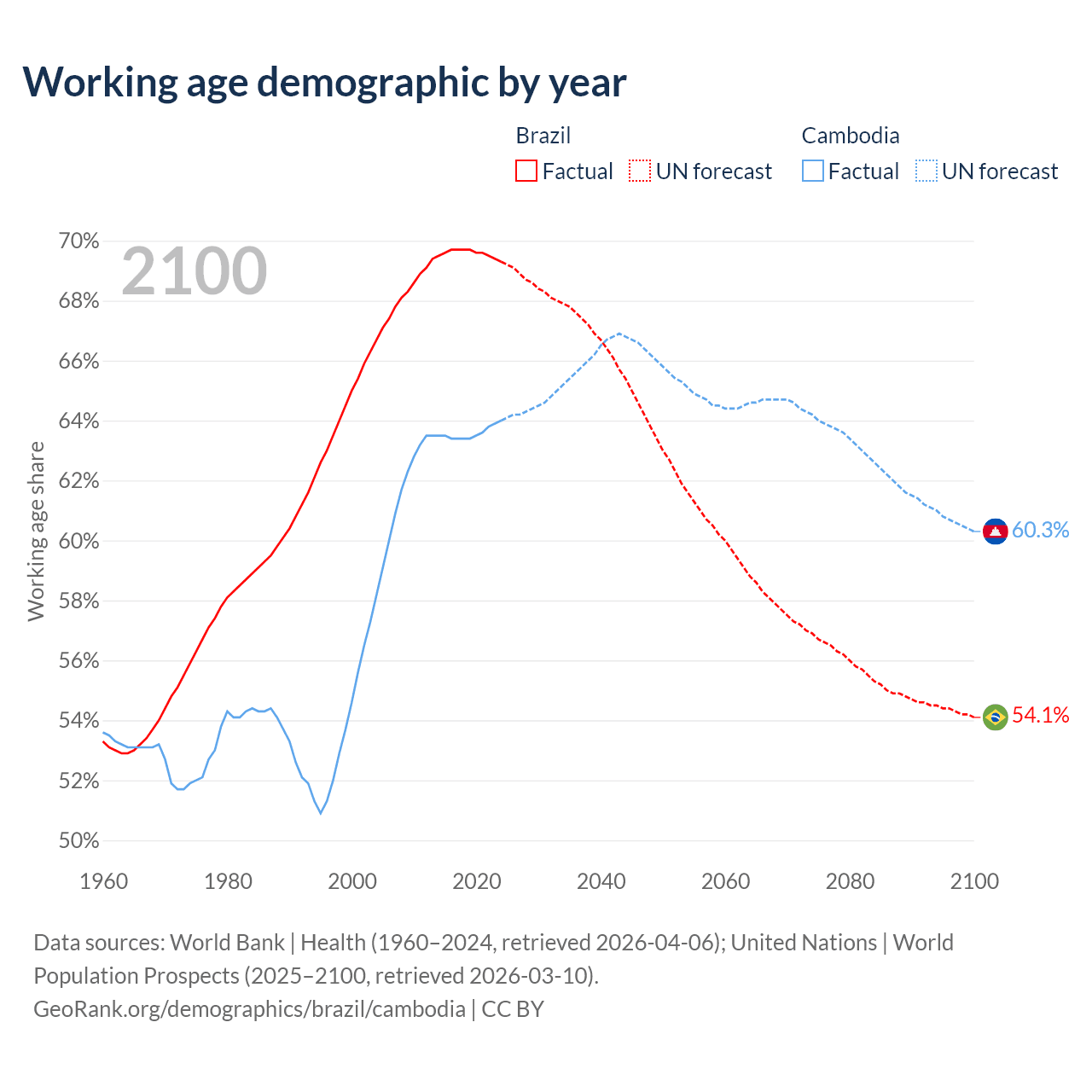 Median age Brazil vs Cambodia, 1960-2100