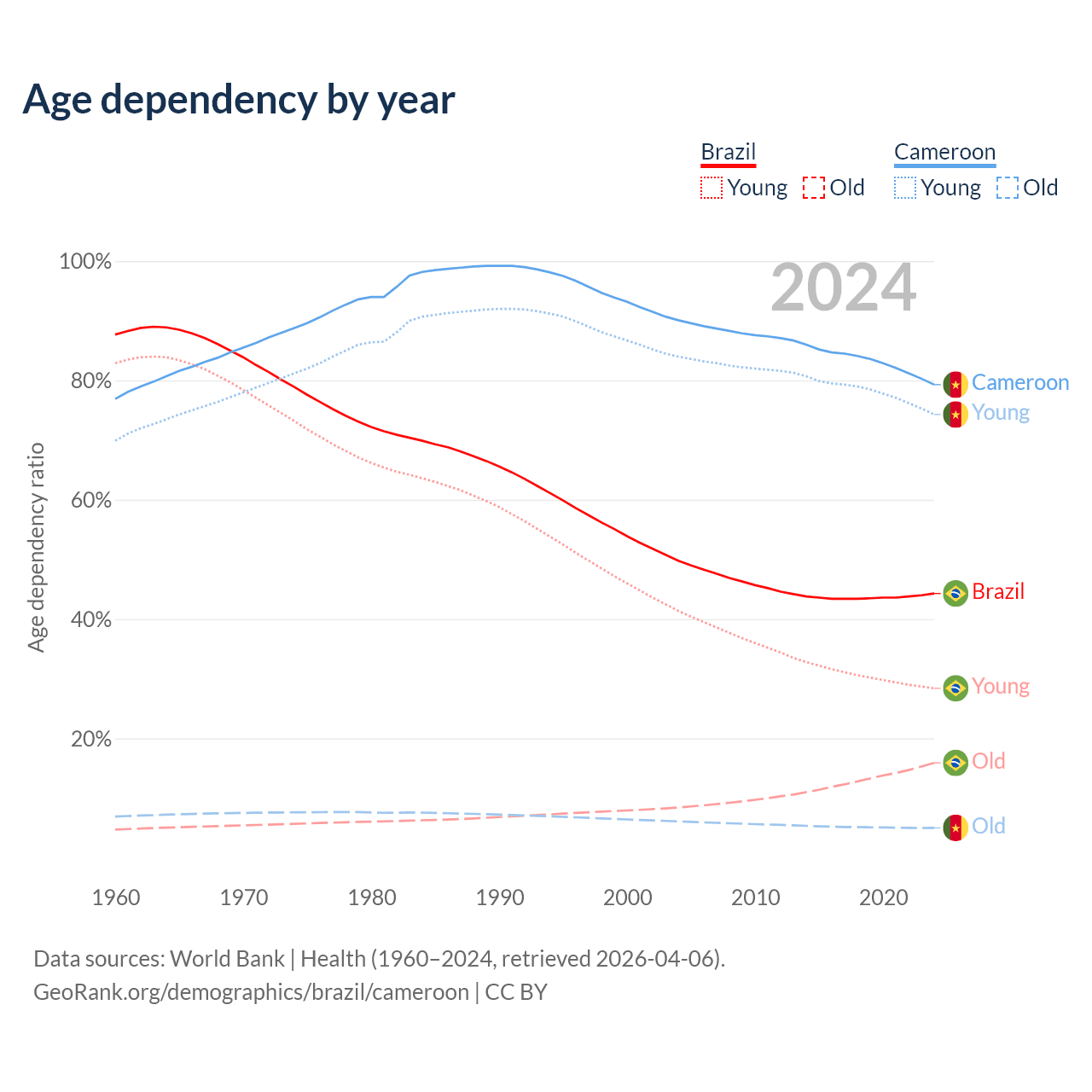 The share of older people aged 65 and over is 11% in Brazil and 2.79% in Cameroon. Life expectancy in Brazil compared to Cameroon .