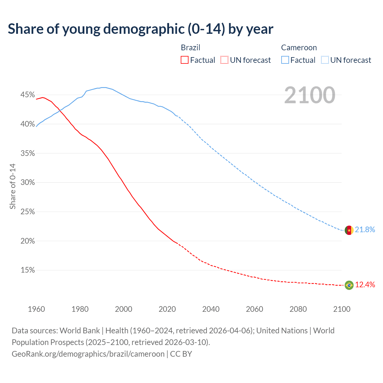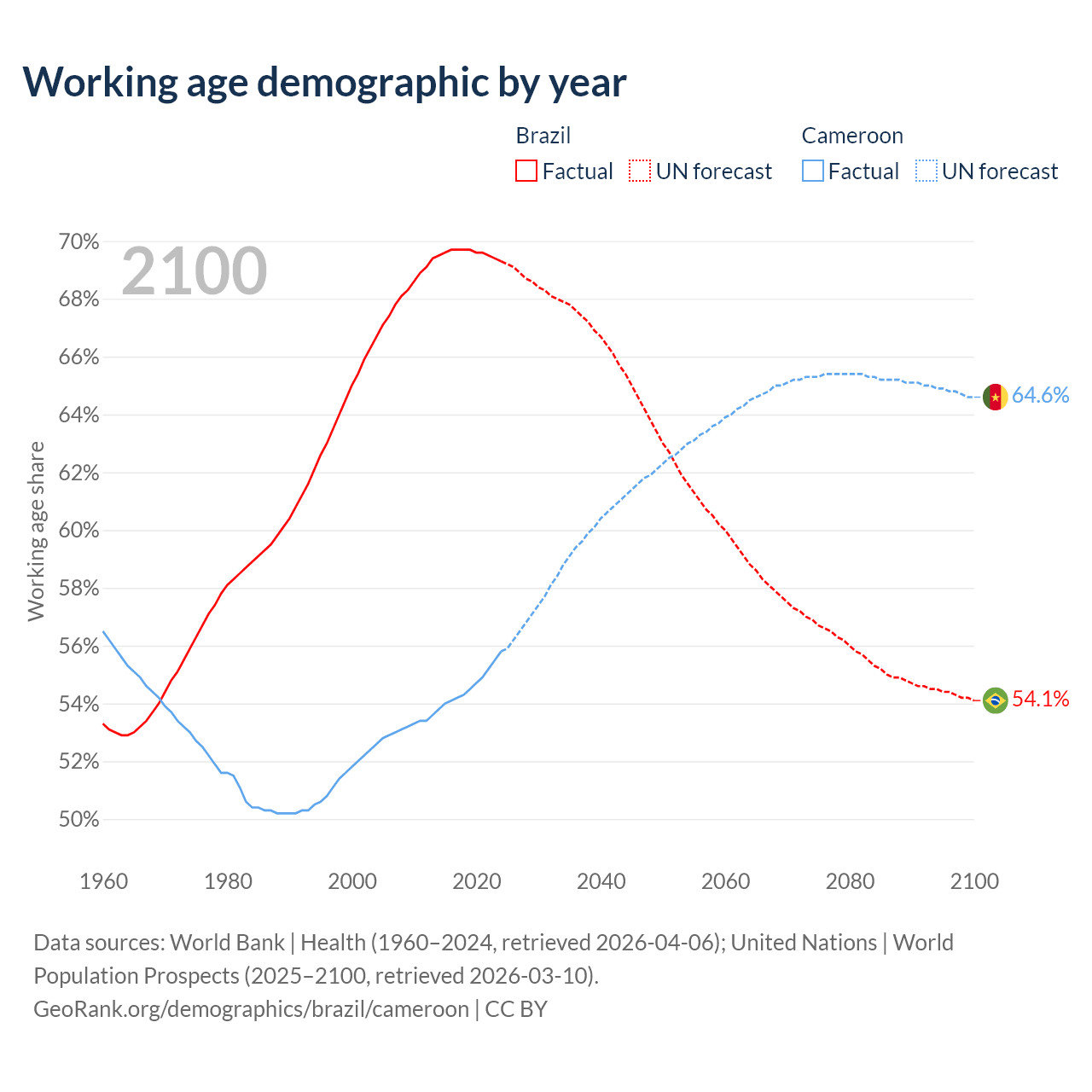 Median age Brazil vs Cameroon, 1960-2100