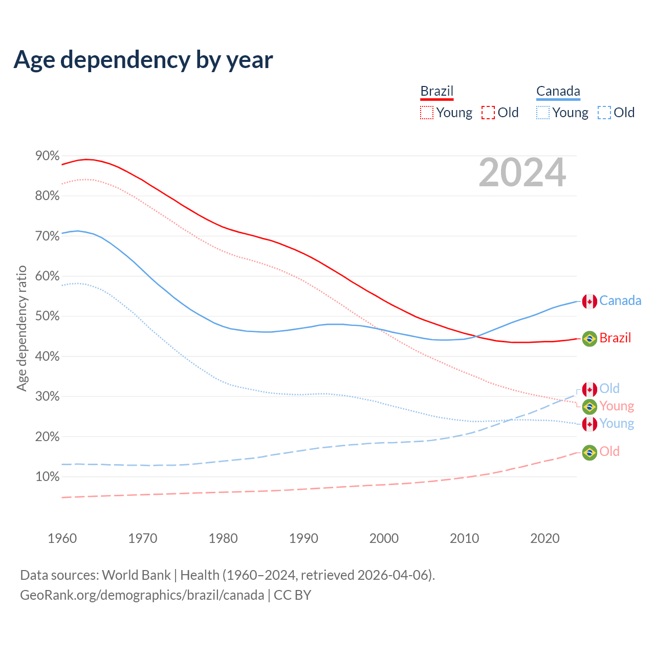 Data sources: World Bank | Health (1960–2024, retrieved 2026-04-06); U.S. Census Bureau (1960–2024, retrieved 2026-02-08).
