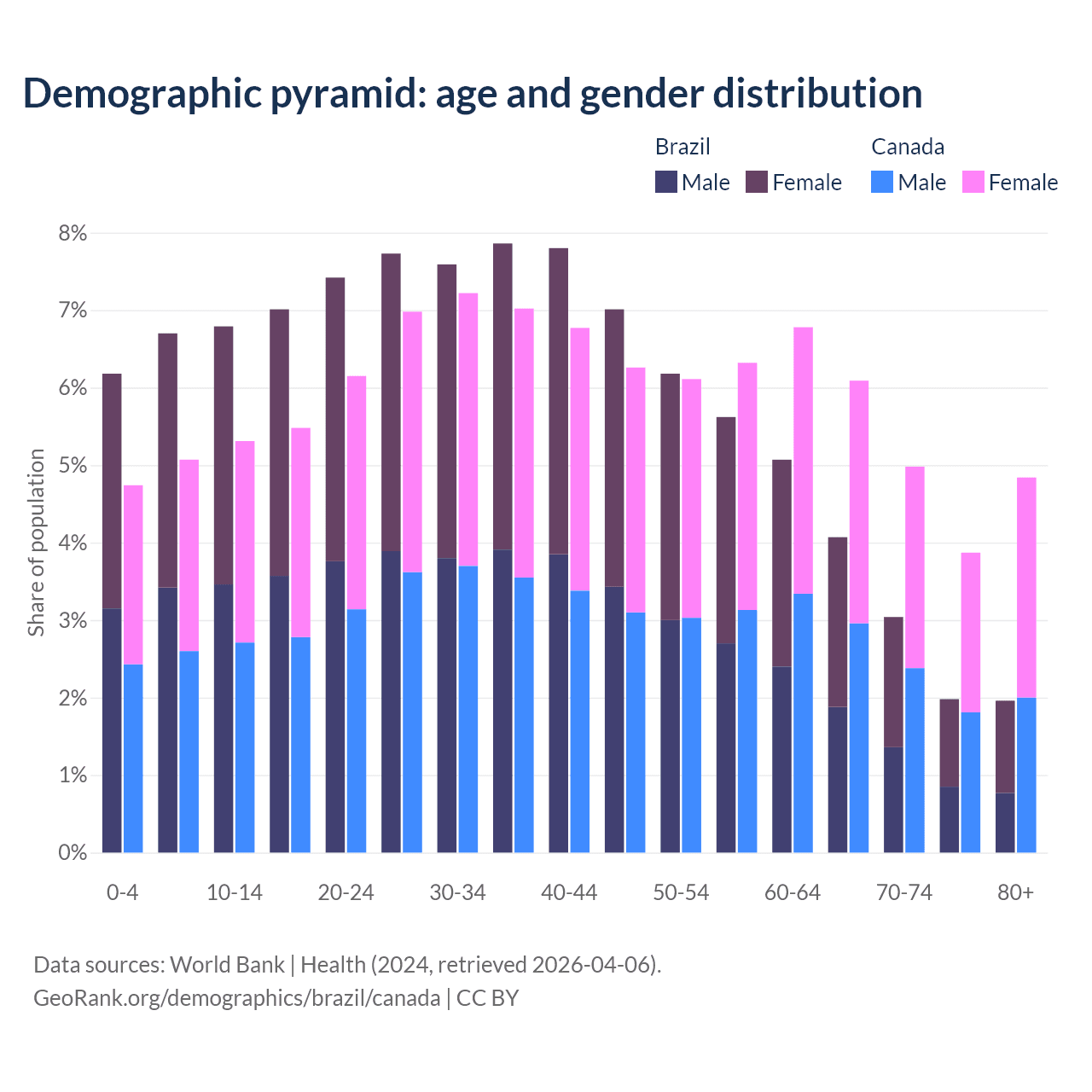 The share of older people aged 65 and over is 11% in Brazil and 19.8% in Canada. Life expectancy in Brazil compared to Canada .