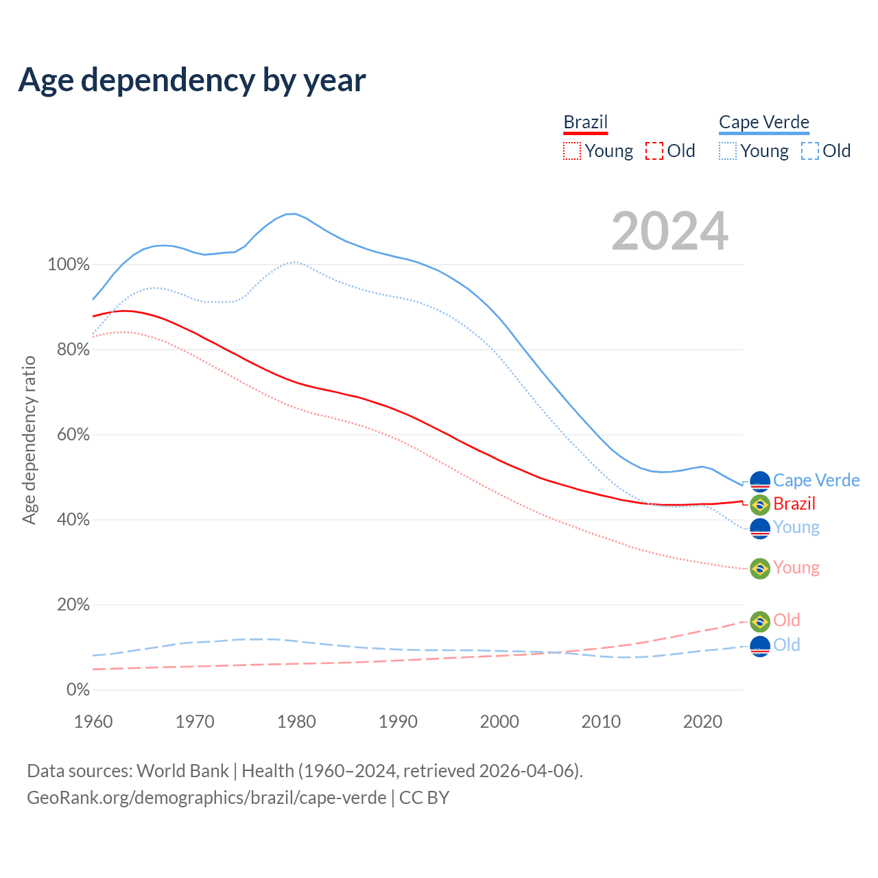 - Brazil is ranked 73/196 by median age (oldest to youngest) vs 110/196 for Cape Verde.