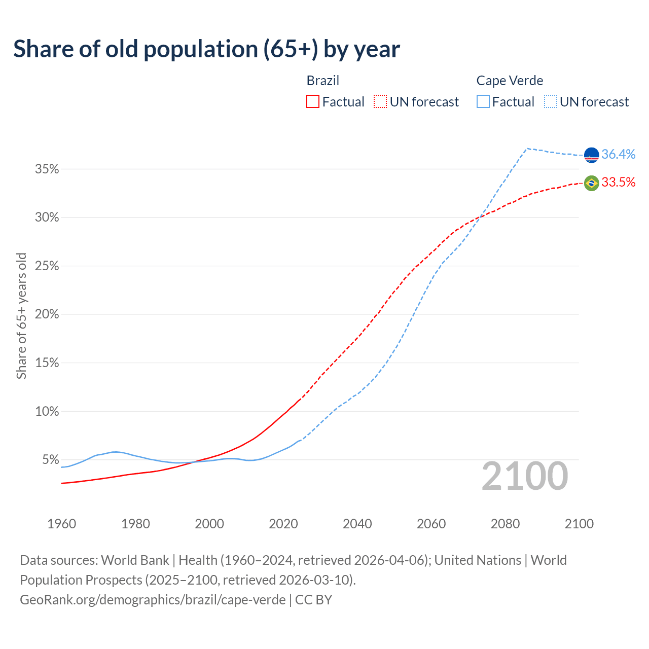 The share of older people aged 65 and over is 11% in Brazil and 6.86% in Cape Verde. Life expectancy in Brazil compared to Cape Verde .