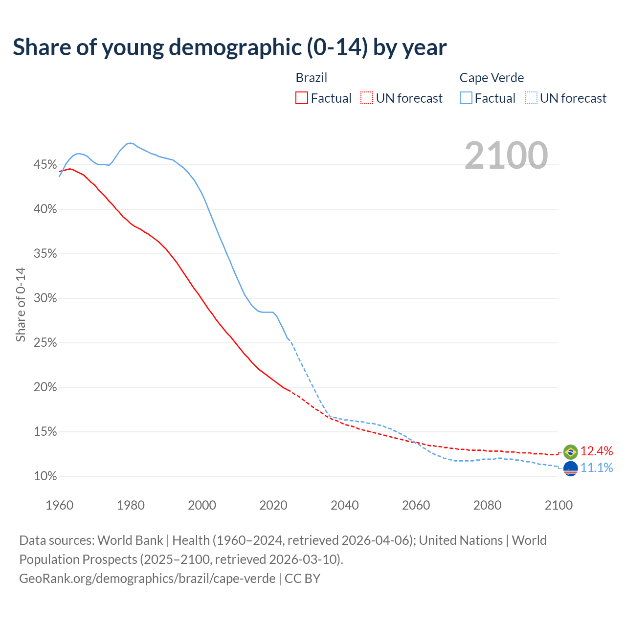 - The share of young demographic (0-15 years old) in Brazil is 19.7% vs 25.5% in Cape Verde.