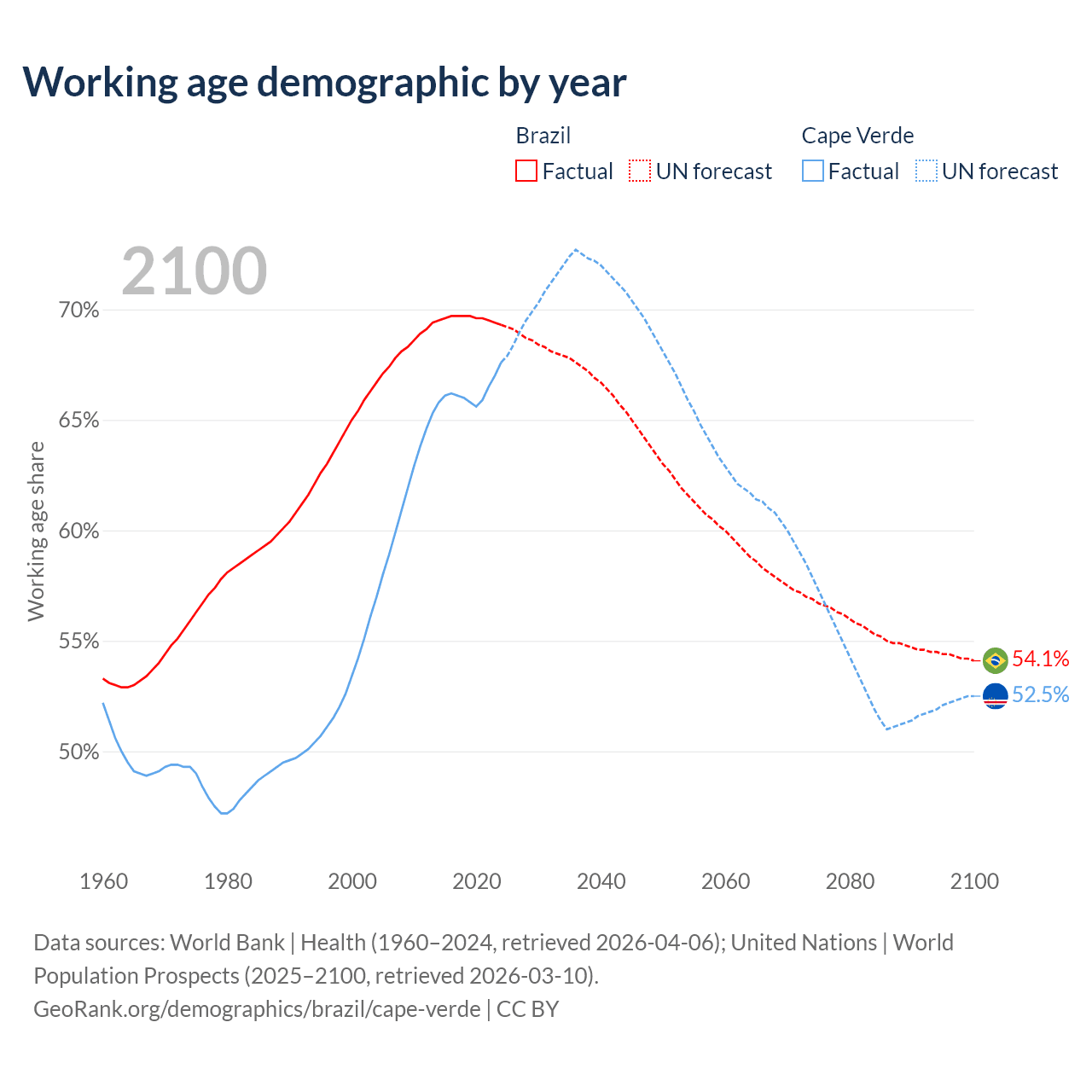 - Brazil has 148M working age adults (aged 15-64) vs 359K in Cape Verde.