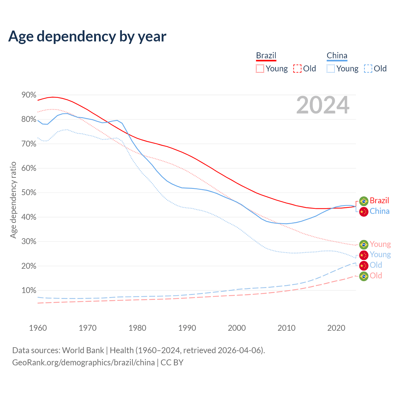 - Brazil is ranked 73/196 by median age (oldest to youngest) vs 44/196 for China.