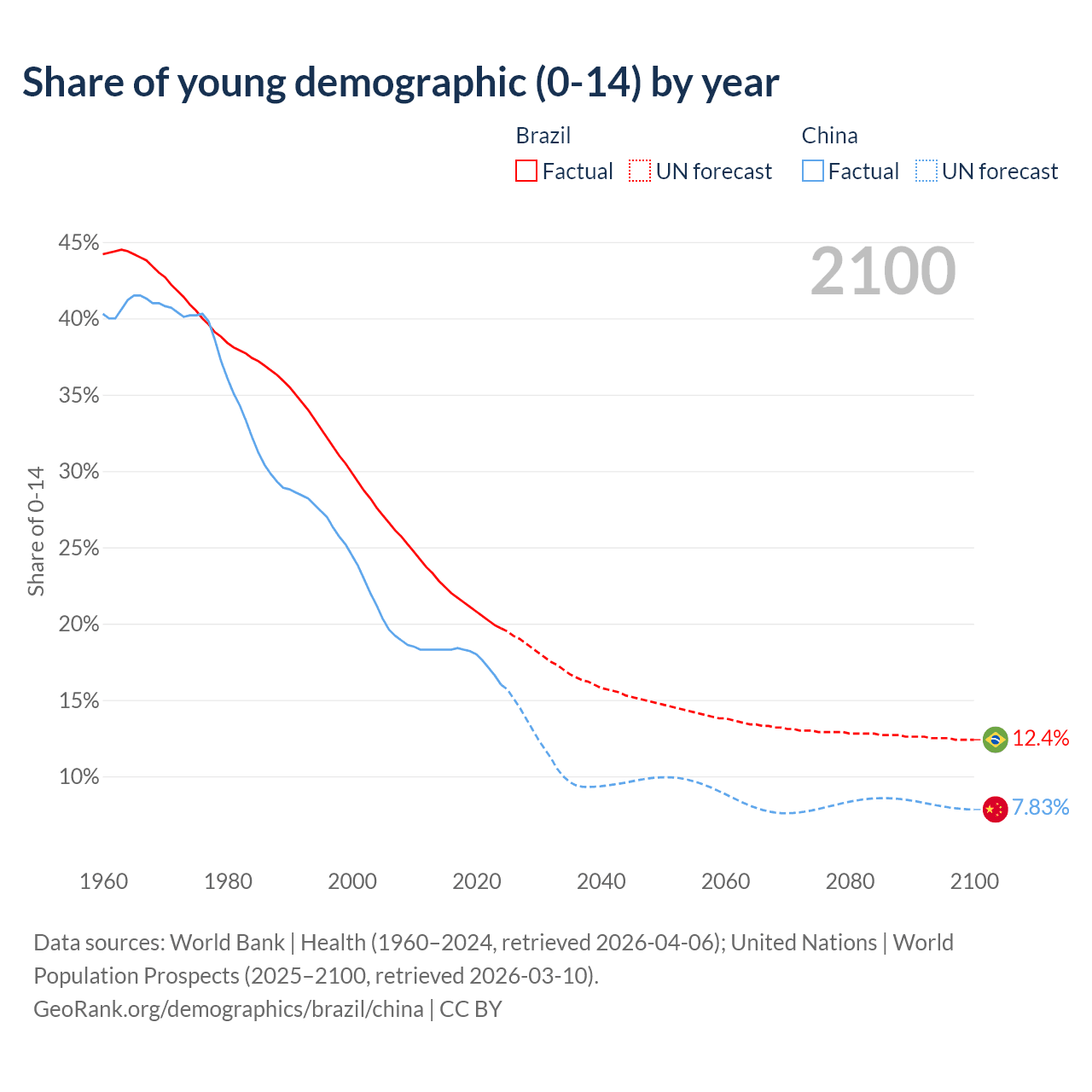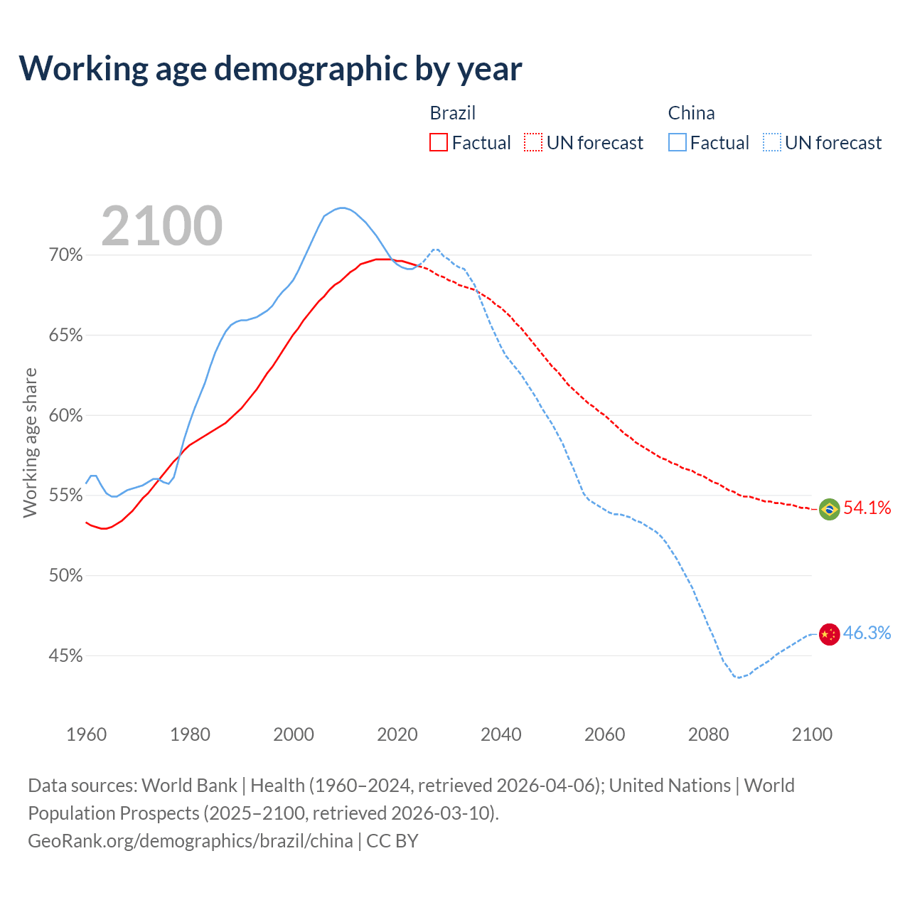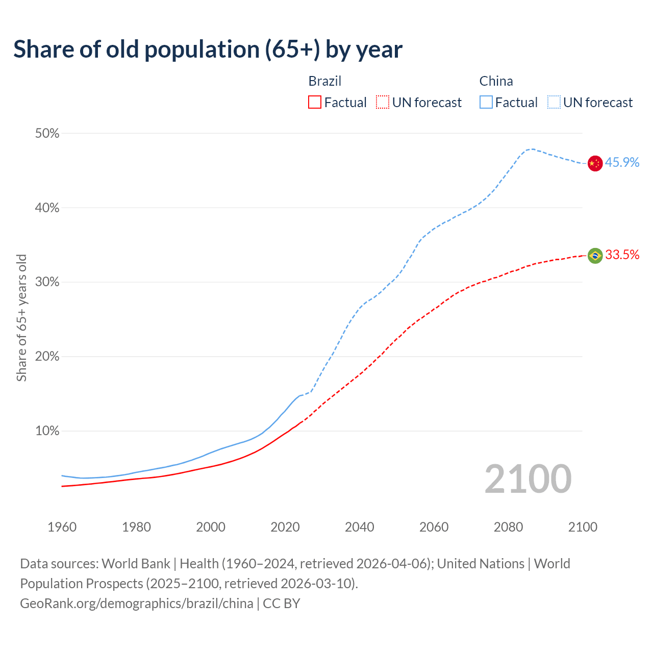 Median age Brazil vs China, 1960-2100