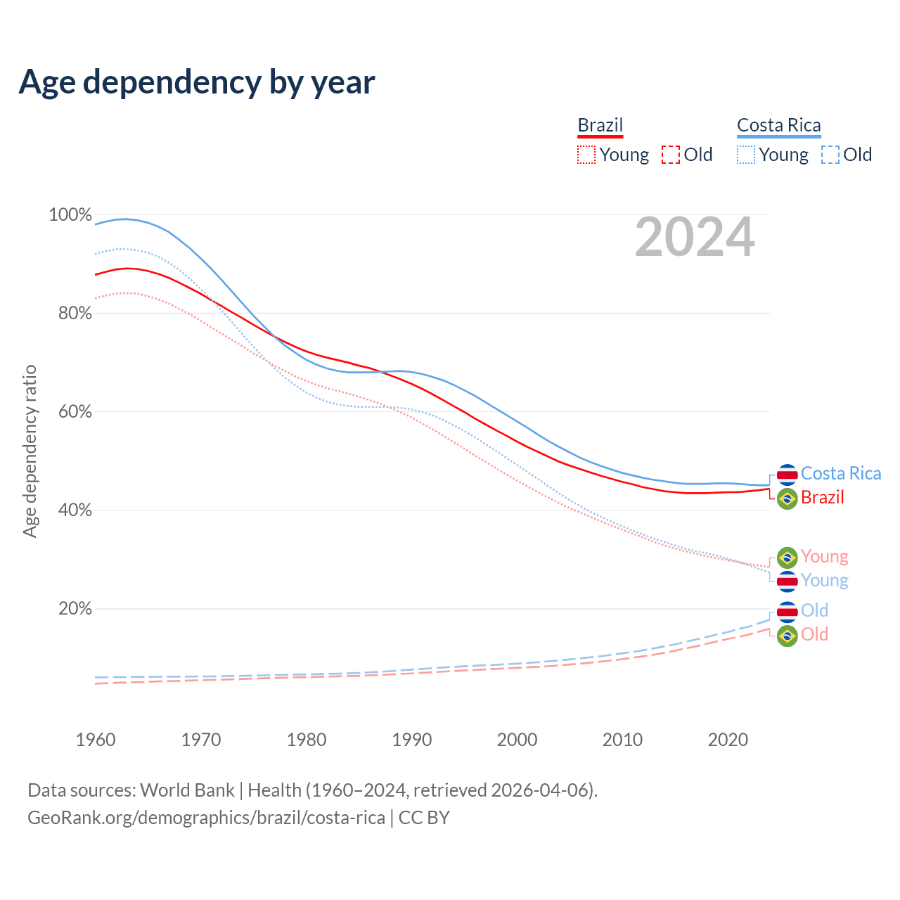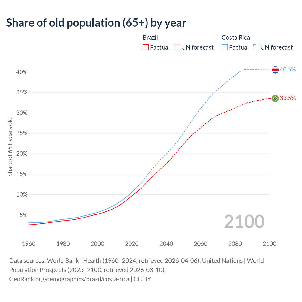 The share of older people aged 65 and over is 11% in Brazil and 12.2% in Costa Rica. Life expectancy in Brazil compared to Costa Rica .