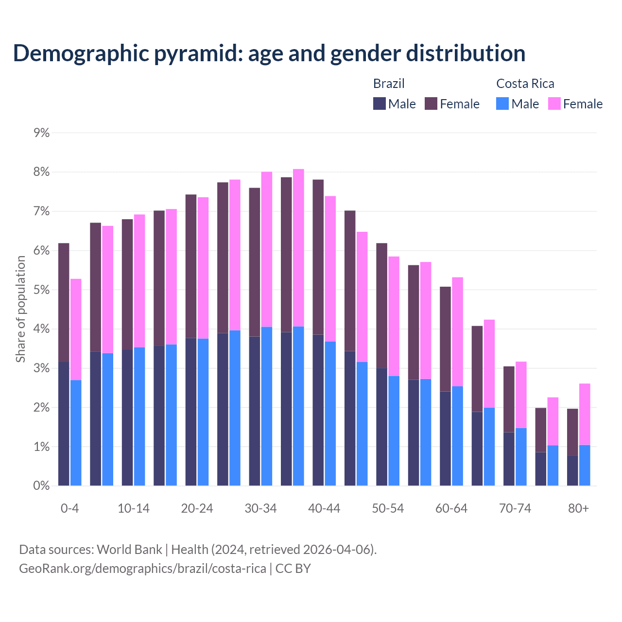 - Brazil is ranked 73/196 by median age (oldest to youngest) vs 72/196 for Costa Rica.